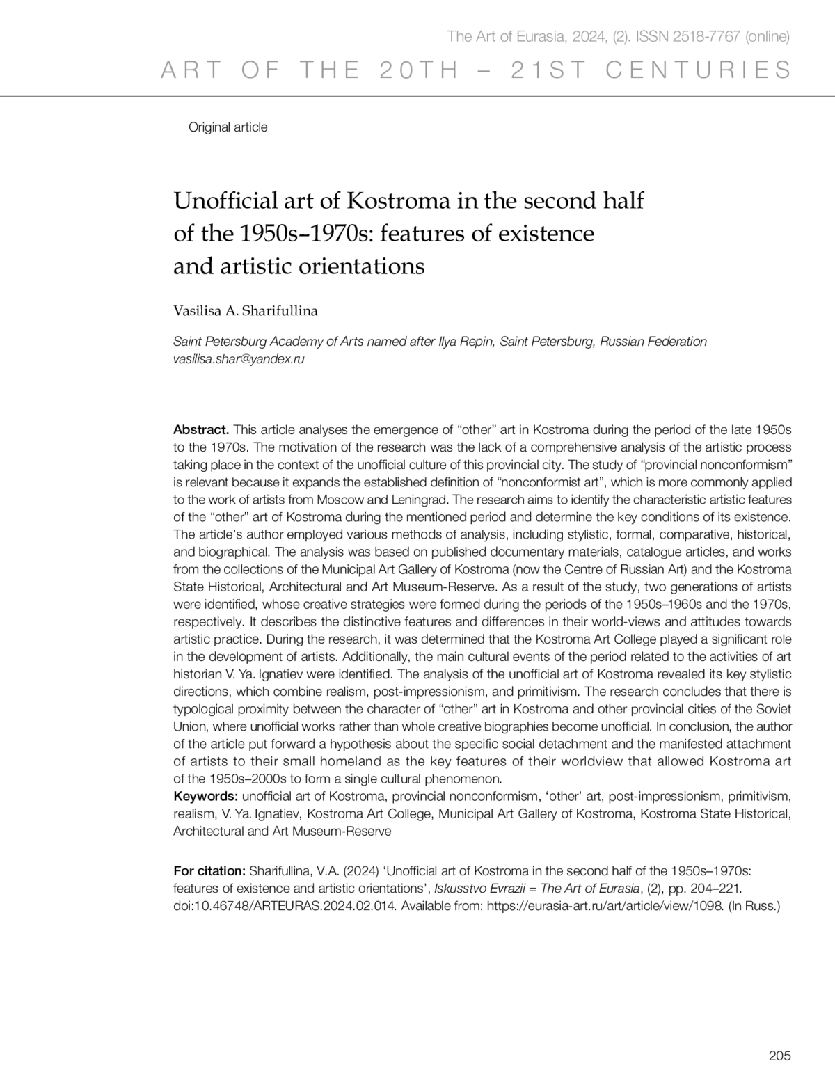Шарифуллина В.А. Неофициальное искусство Костромы второй половины 1950–1970-х годов: особенности бытования и художественные ориентиры // Искусство Евразии