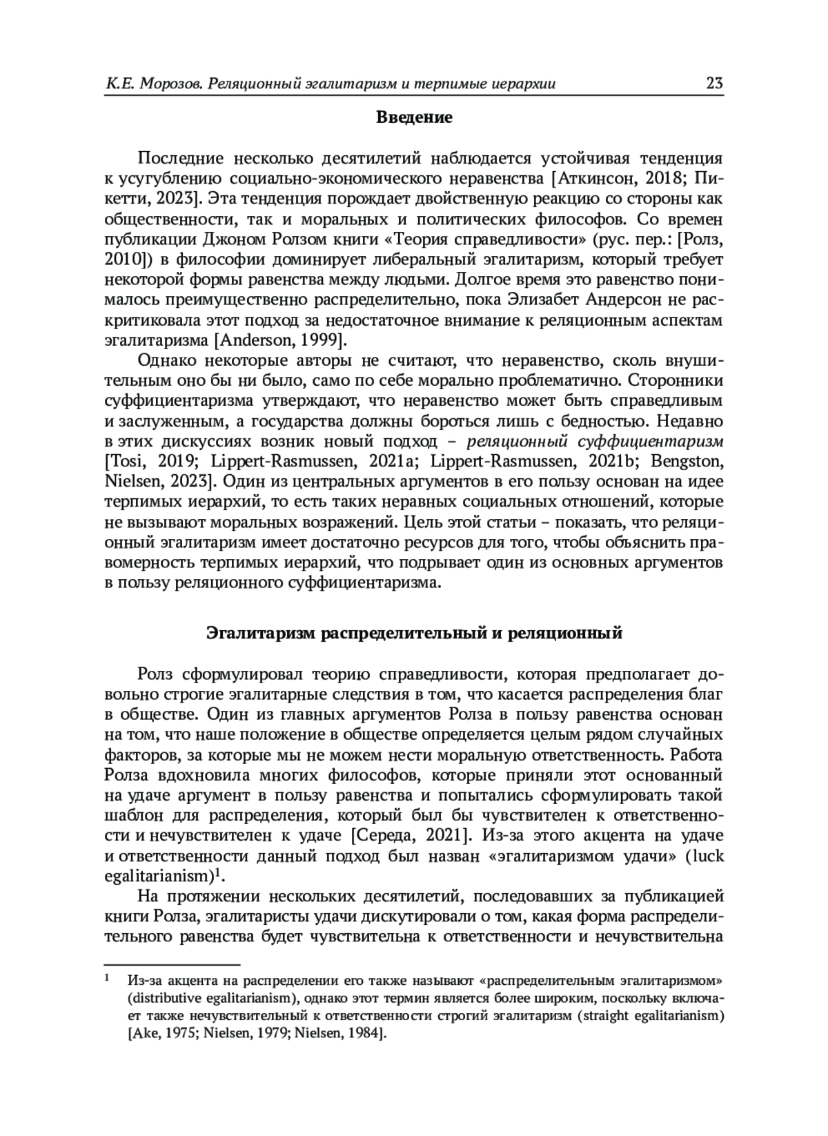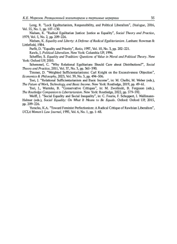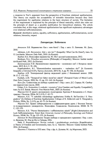 6. Морозов К.Е. В защиту ролзианского эгалитаризма: Критика Р. Бельковича и С. Виноградова // Полития. 2024а. № 2 (113). С. 62-75.