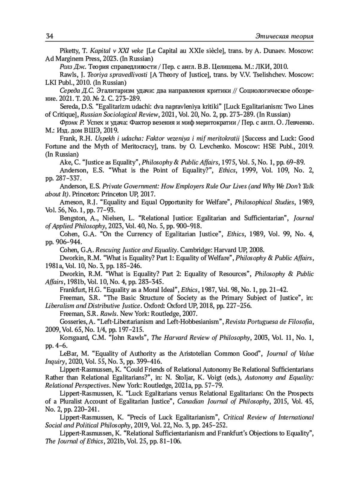 33. Lippert-Rasmussen, K. “Relational Sufficientarianism and Frankfurt’s Objections to Equality”, The Journal of Ethics, 2021b, Vol. 25, pp. 81-106.