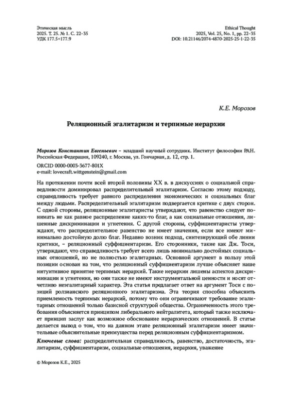 На протяжении почти всей второй половины XX в. в дискуссиях о социальной справедливости доминировал распределительный эгалитаризм. Согласно этому подходу, справедливость требует равного распределения экономических и социальных благ между людьми. Распределительный эгалитаризм подвергается критике с двух сторон. С одной стороны, реляционные эгалитаристы утверждают, что равенство следует понимать не как равное распределение каких-то благ, а как социальные отношения, лишенные дискриминации и угнетения. С другой стороны, суффициентаристы утверждают, что распределительное равенство не имеет значения, если все имеют минимально достойную долю благ. Недавно возник подход, синтезирующий обе линии критики, – реляционный суффициентаризм. Его сторонники, такие как Дж. Тоси, утверждают, что справедливость требует всего лишь минимально достойных социальных отношений, но не полностью эгалитарных. Основной аргумент в пользу этой позиции основан на том, что реляционный суффициентаризм лучше объясняет наше интуитивное принятие терпимых иерархий. Такие иерархии лишены аспектов дискриминации и угнетения, но они также не имеют инструментальной ценности и носят отчетливо неэгалитарный характер. Эта статья предлагает ответ на аргумент Тоси с позиций ролзианского реляционного эгалитаризма. Эта теория способна объяснить приемлемость терпимых иерархий, потому что они ограничивают требование эгалитарных отношений только базисной структурой общества. Ограниченность этого требования объясняется принципом либерального нейтралитета, который также исключает принцип заслуг как возможное обоснование иерархических отношений. В статье делается вывод о том, что на данном этапе реляционный эгалитаризм имеет значительные объяснительные преимущества перед реляционным суффициентаризмом.