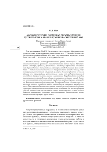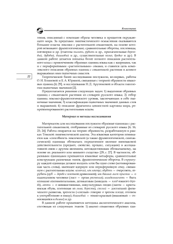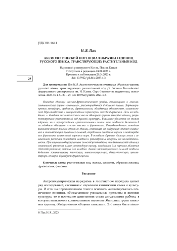 Языковые единицы лексико-фразеологического уровня, относящиеся к лексикосемантической группе «растения», рассматриваются в аспекте оценки. Характеризуются метафоры, сравнения, фразеологизмы, обладающие образностью, семантической двуплановостью и ассоциативным характером способа выражения. Цель исследования — выявить аксиологические смыслы обширной группы языковых единиц, репрезентирующих растительный код русской культуры. Внимание уделяется не только ядерным, но и периферийным «растительным» семам, что позволяет включить в исследование обширные пласты лексики и фразеологии. Разрабатывается методика аксиологического анализа образных единиц, состоящая из следующих этапов: выявление и типологизация оценочных смыслов, определение основания оценки и моделирование фрагмента ценностной картины мира. В основном образные единицы языка с семантикой растения описывают человека и разнообразные стороны его жизнедеятельности. При изучении общеоценочных смыслов установлено, что большинство единиц с семантикой растения имеет негативную оценку, основанием для переноса являются свойства растений, опасные для человека. Анализ частнооценочных смыслов позволил выделить эстетическую, этическую, интеллектуальную, валеологическую, утилитарную, сенсорно-вкусовую и другие оценки