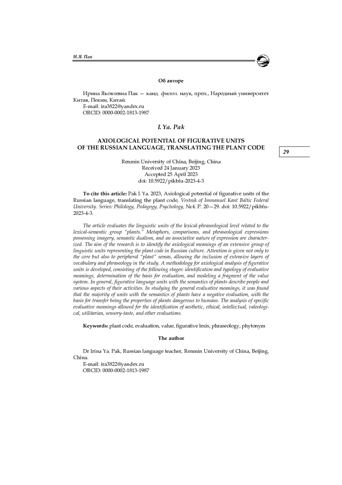 9. Карпун М. А. Элементы растительного кода, характеризующие человека, в традиционной культуре донского казачества // Acta Linguistica Petropolitana. Труды Института лингвистических исследований. 2017. Т. 13, № 2. С. 221-238. EDN: YTDOZS