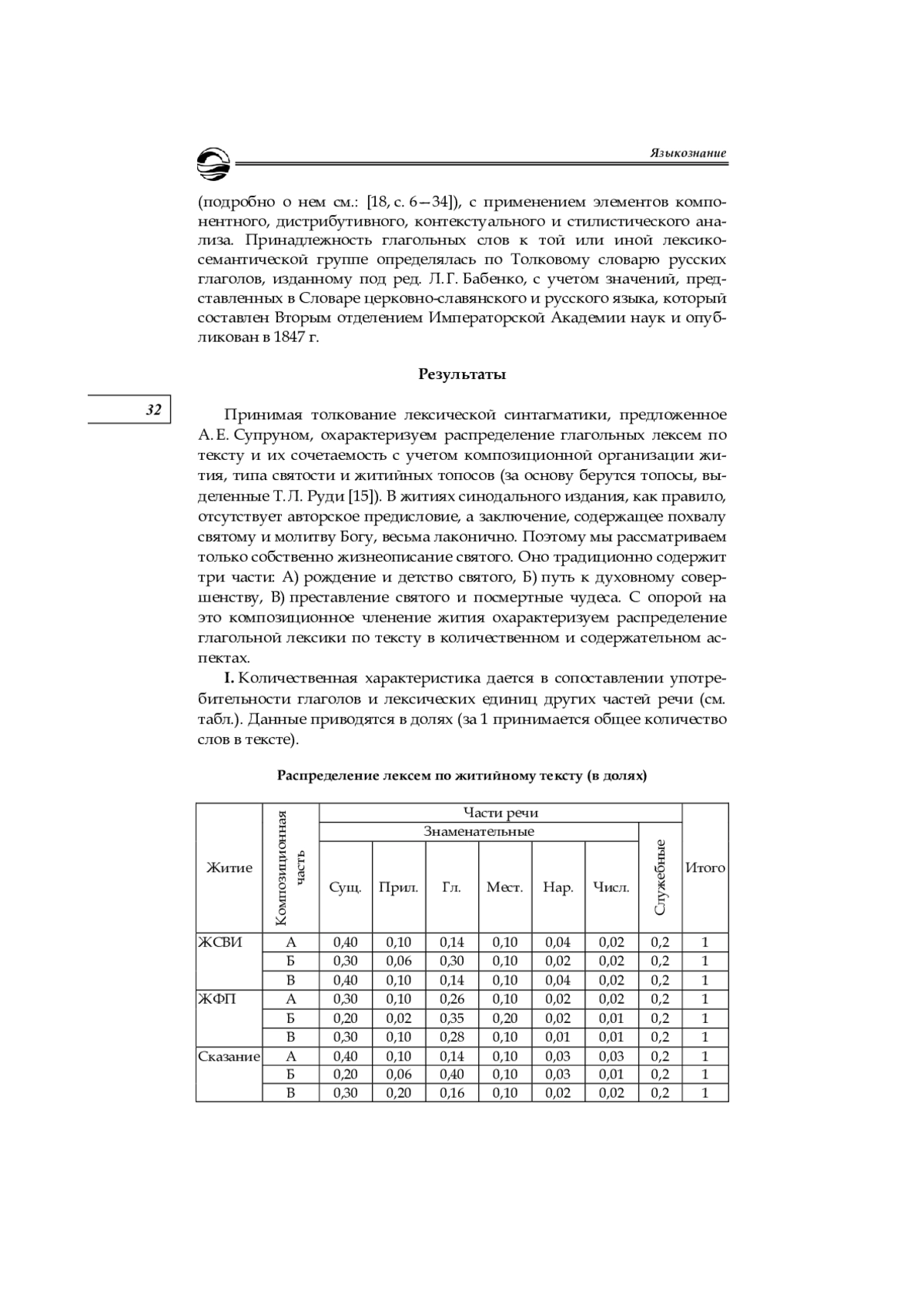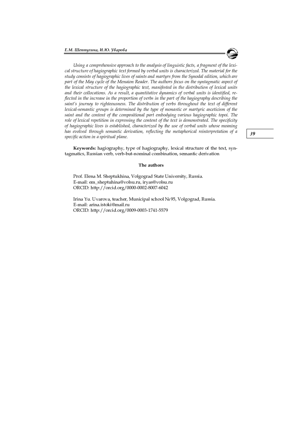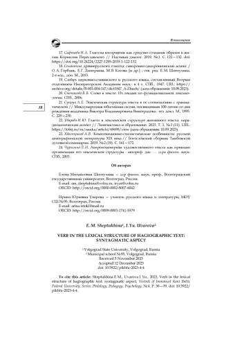 C применением комплексного подхода к анализу языковых фактов охарактеризован фрагмент лексической структуры агиографического текста, формируемый глагольными единицами. Материалом для исследования послужили преподобнические и мученические жития синодального издания, входящие в майский цикл Миней Четьих. В центре внимания авторов находится синтагматический аспект лексической структуры агиографического текста, реализующийся в распределении лексических единиц и их сочетаемости. В результате выявлена количественная динамика глагольных единиц, которая проявляется в увеличении доли глаголов в части жития, где описывается движение святого по пути обретения праведности. Распределение по тексту глаголов разных лексико-семантических групп обусловлено типом монашеской или мученической аскезы святого и содержанием композиционной части, в которой воплощаются те или иные житийные топосы. Показана роль лексического повтора в выражении содержания текста. Установлена специфика преподобнических житий, заключающаяся в употреблении глагольных единиц, значение которых сформировалось в результате семантической деривации как отражения метафорического переосмысления конкретного действия в духовном плане