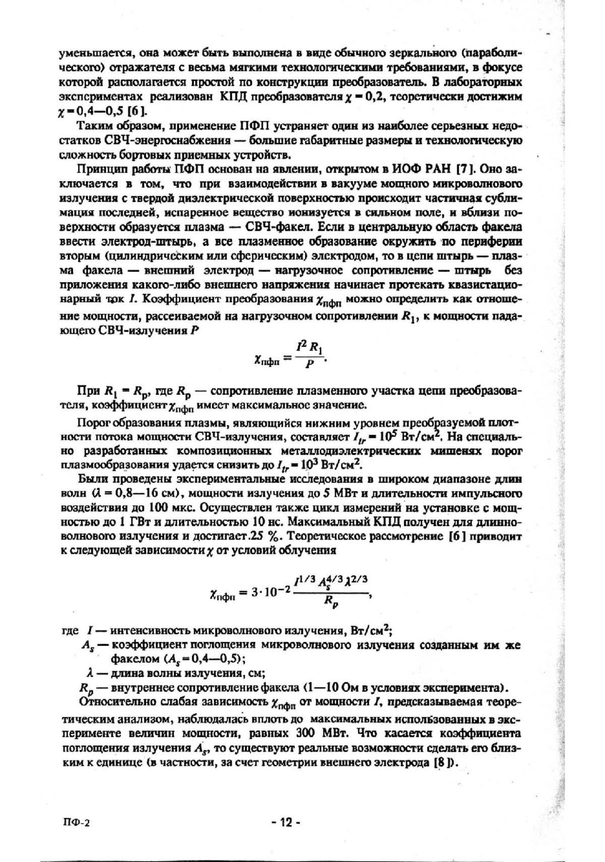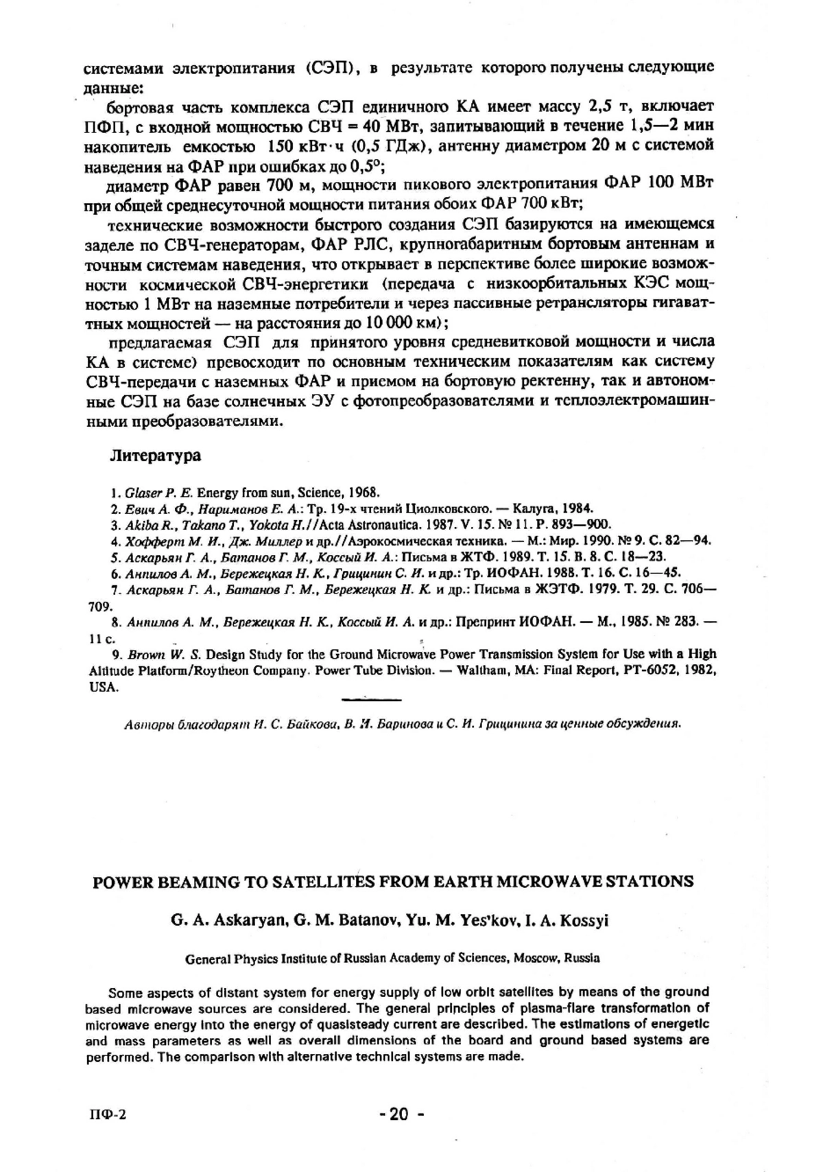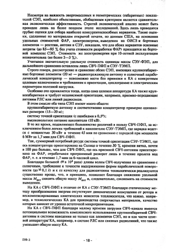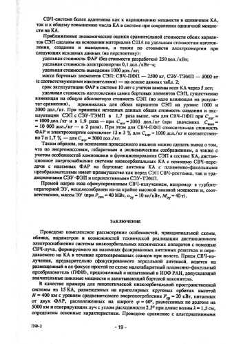 бортовая часть комплекса СЭП единичного КА имеет массу 2,5 т, включает ПФП, с входной мощностью СВЧ= 40 МВт, запитывающий в течение 1,5-2 мин накопитель емкостью 150 кВт·ч (0,5 ГДж), антенну диаметром 20 мс системой наведения на ФАР при ошибках до 0,5°;