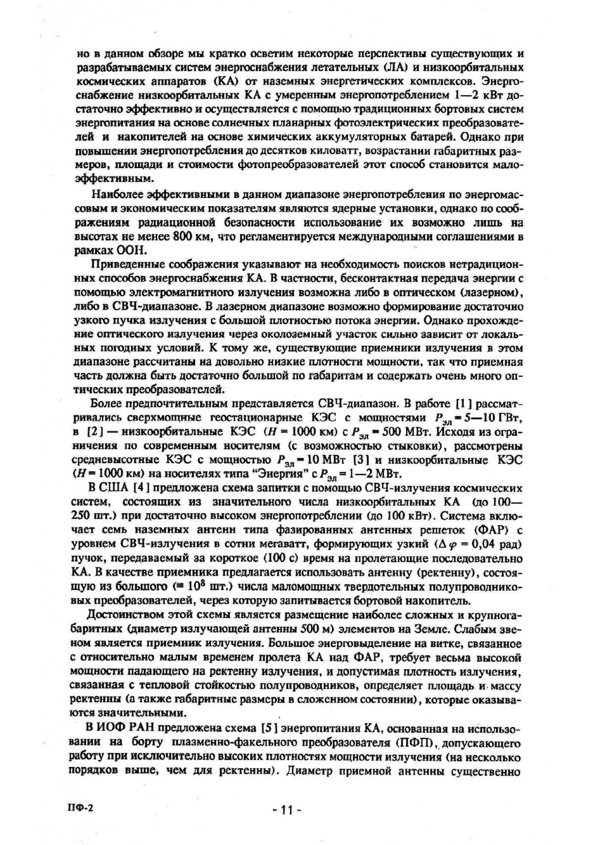 Проведено комплексное рассмотрение особенностей, принципиальной схемы, облика, параметров и возможностей технической реализации дистанционного электроснабжения системы низкоорбитальных космических аппаратов с помощью СВЧ-луча, формируемого на наземных фазированных антенных решетках и передаваемого на КА в течение кратковременных сеансов при полете. Прием СВЧ-излучения, предварительно сфокусированного зеркальной антенной, ведется на размещенный в ее фокусе простой по схеме малогабаритный плазменно-факельный преобразователь (ПФИ), предложенный и испытанный в ИОФ РАН, допускающий значительные пиковые мощности и запитывающий бортовой накопитель.