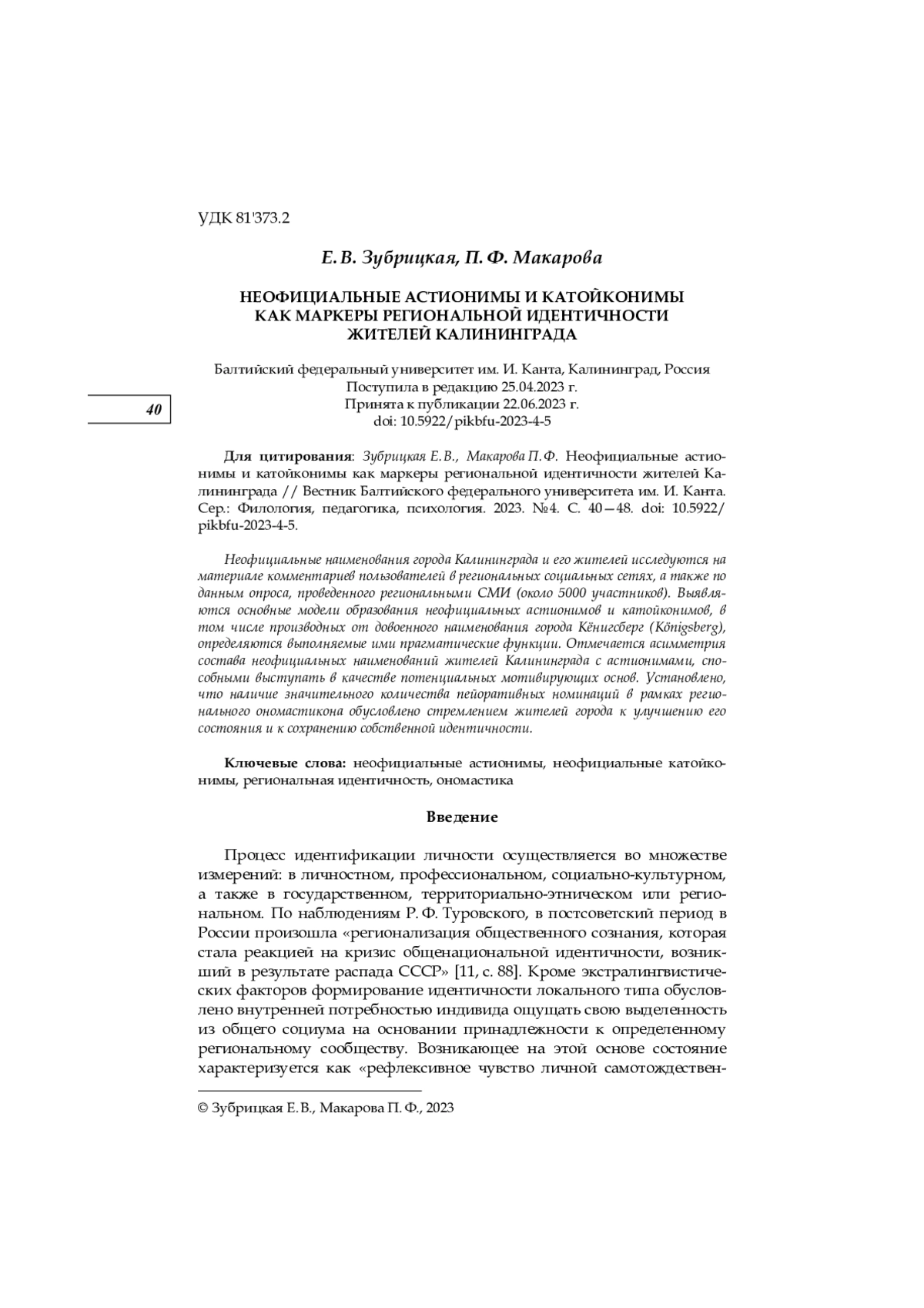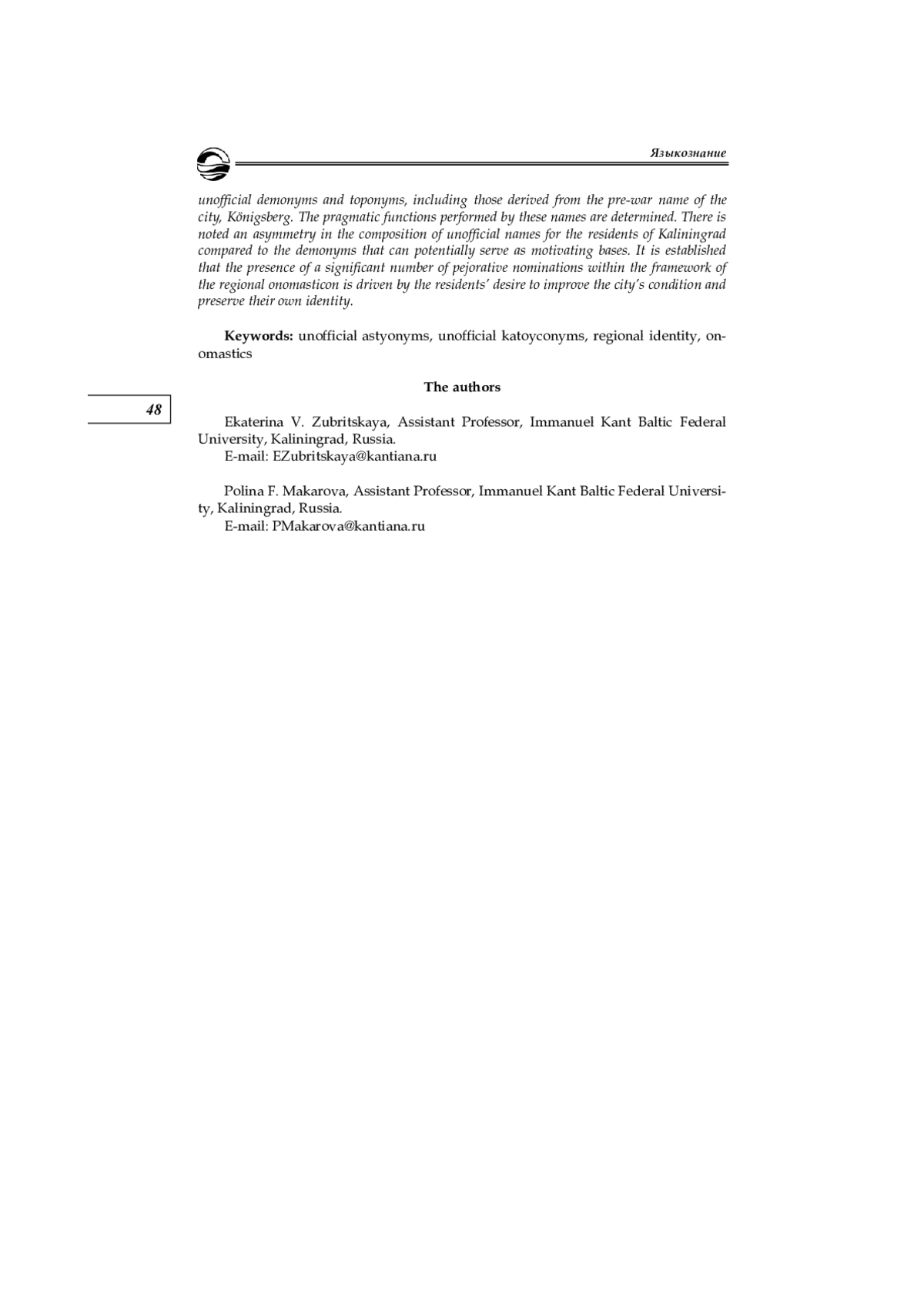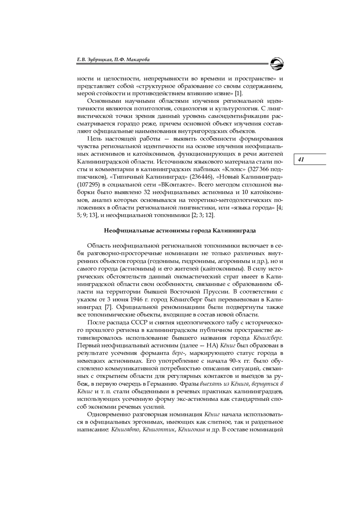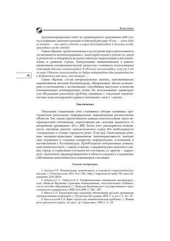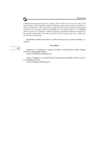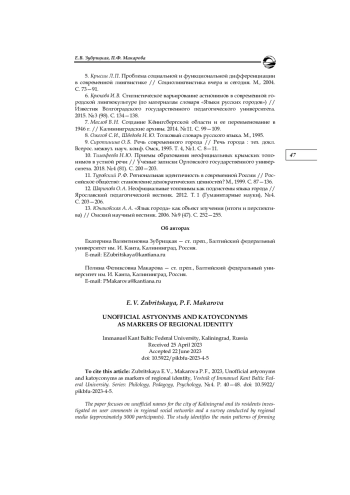 Неофициальные наименования города Калининграда и его жителей исследуются на материале комментариев пользователей в региональных социальных сетях, а также по данным опроса, проведенного региональными СМИ (около 5000 участников). Выявляются основные модели образования неофициальных астионимов и катойконимов, в том числе производных от довоенного наименования города Кёнигсберг (Königsberg), определяются выполняемые ими прагматические функции. Отмечается асимметрия состава неофициальных наименований жителей Калининграда с астионимами, способными выступать в качестве потенциальных мотивирующих основ. Установлено, что наличие значительного количества пейоративных номинаций в рамках регионального ономастикона обусловлено стремлением жителей города к улучшению его состояния и к сохранению собственной идентичности