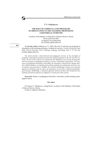 Представлен краткий историко-педагогический обзор ориентации выпускников образовательных учреждений на педагогическую профессию в XIX—XX вв. Цель исследования — показать значение учебных планов и программ при появлении в женских образовательных организациях обучения педагогической направленности. Подробно раскрыт опыт образовательных организаций, в частности Александровского училища и Смольного института благородных девиц, по подготовке будущих выпускниц к профессиональной деятельности в качестве домашних учительниц, гувернанток. Методология исследования основана на аспектном подходе: в вопросе обучения, имеющего педагогическую направленность, рассматривается только один аспект — значение учебных планов в реализации такого обучения. Также в определенной части применяются концептуальный подход, исторический метод и изучение практического опыта, рассматриваемого в ретроспективе.