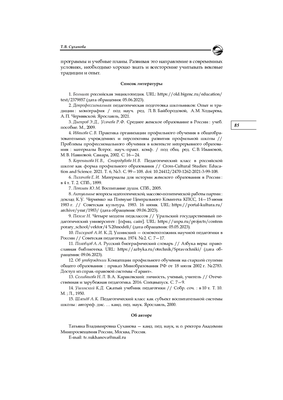 5. Корепанова Н. В., Стародубова Н. В. Педагогический класс в российской школе как форма профильного образования // Cross-Cultural Studies: Education and Science. 2021. Т. 6, № 3. С. 99-108. DOI: 10.24412/2470-1262-2021-3-99-108 EDN: JPDNRO