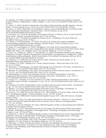 31. Лбова Л.В., Панкина А.И., Волков П.В., Казаков В.В. Зооморфная пластика в сибирских коллекциях верхнего палеолита (документирование, систематизация, подходы к классификации) // Краткие сообщения Института археологии. 2020. № 260. С. 80-92. DOI: 10.25681/IARAS.0130-2620.260.80-92 EDN: RRXPNS