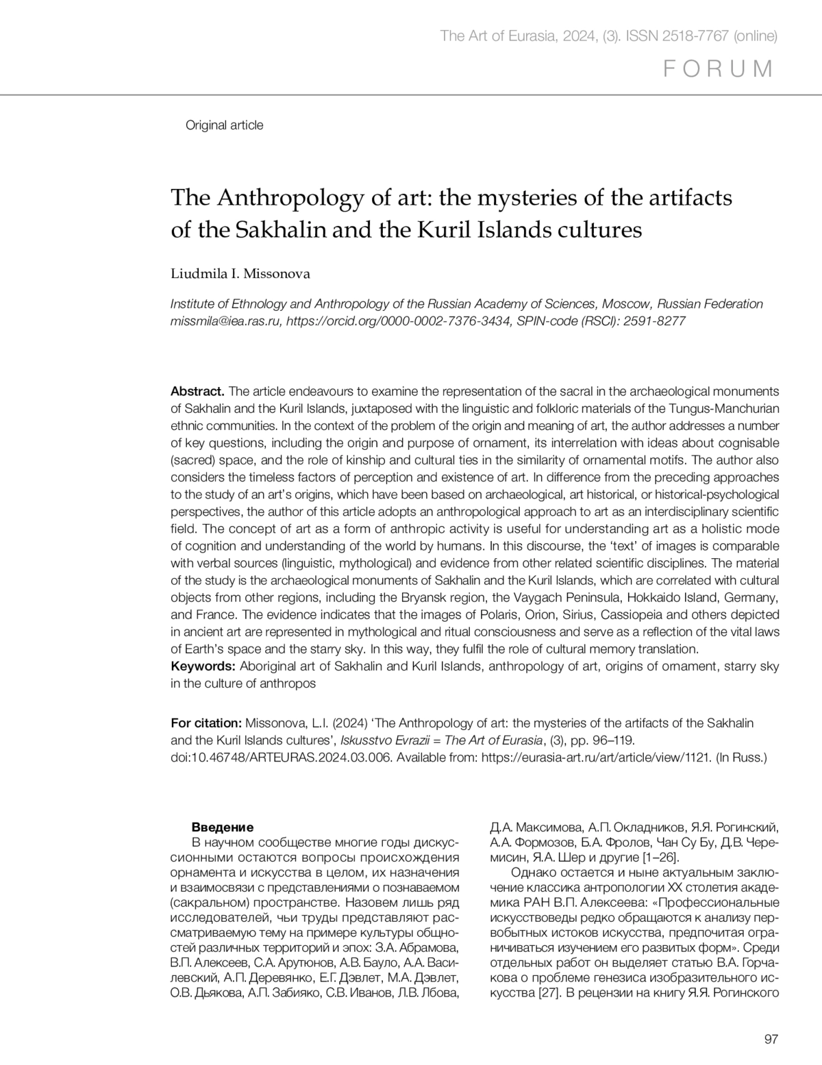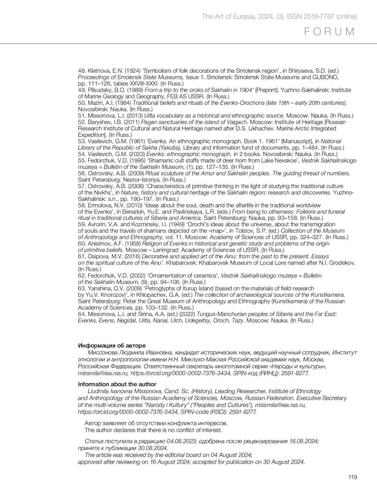 45. Миссонова Л.И. Многомерность пространства в мировоззрении и искусстве тунгусо-маньчжурской малочисленной этнической общности острова Сахалин // Археология, этнография и антропология Евразии. 2013. № 1 (53). С. 121-130. EDN: PXQONN