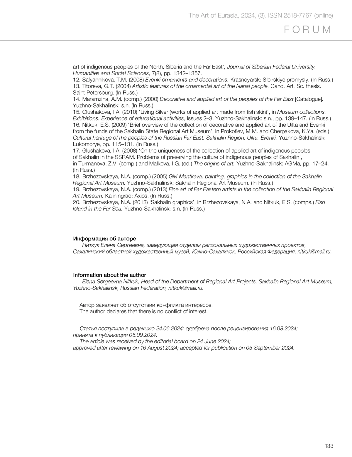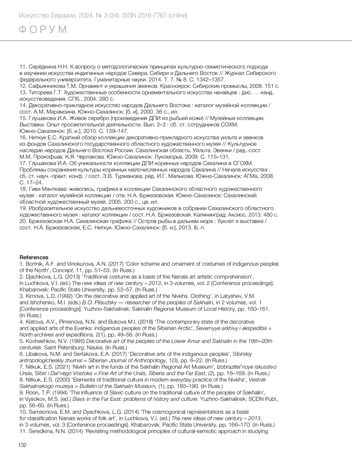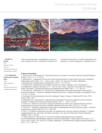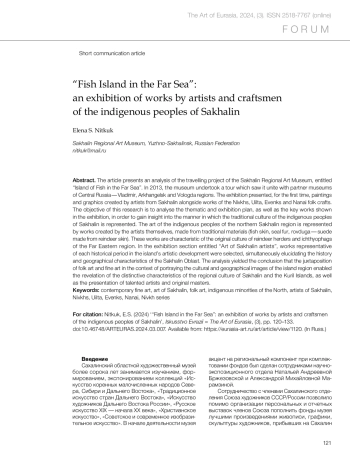 Ниткук Е.С. «Остров рыбы в дальнем море»: выставка произведений художников и мастеров коренных народов Сахалина // Искусство Евразии [Электронный журнал]. 2024. No 3 (34). С. 120–133. https://doi.org/10.46748/ARTEURAS.2024.03.007. URL: https://eurasia-art.ru/art/article/view/1120.