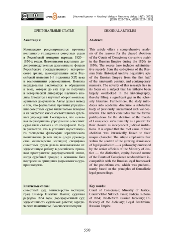 Комплексно рассматриваются причины поэтапного упразднения совестных судов в Российской империи периода 1820—1850-х годов. Источниками выступили делопроизводственные документы из фондов Российского государственного исторического архива, законодательные акты Российской империи I-й половины XIX века и воспоминания современников. Новизна исследования заключается в обращении к теме, которая до сих пор не получила в исторической литературе научного анализа. Вводится в научный оборот комплекс архивных документов. Автор делает вывод о том, что формальные причины упразднения совестных судов были только поводом к их закрытию как самостоятельных судебных учреждений. Сообщается, что основная первопричина упразднения совестных судов была связана с их спецификой. Подчеркивается, что в условиях нарастающего господства философии юридического позитивизма (в том числе среди руководства министерства юстиции) специфика совестных судов делала невозможным их эффективную работу в российском правовом пространстве дореформенной эпохи, когда судебный процесс в основном был построен на принципах формального судопроизводства.