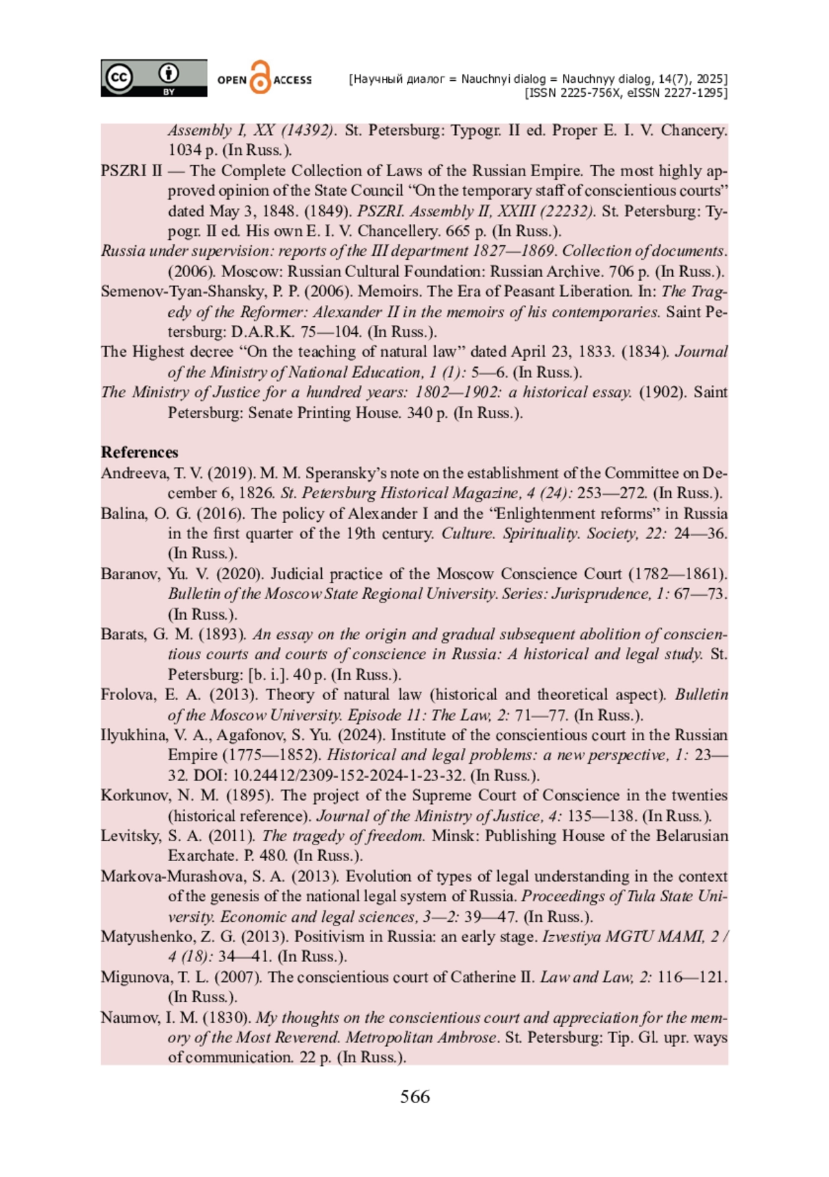 8. Илюхина В. А. Институт совестного суда в Российской империи (1775-1852) / В. А. Илюхина, С. Ю. Агафонов // Историко-правовые проблемы : новый ракурс. - 2024. - № 1. - С. 23-32. - https://doi.org/10.24412/2309-152-2024-1-23-32.