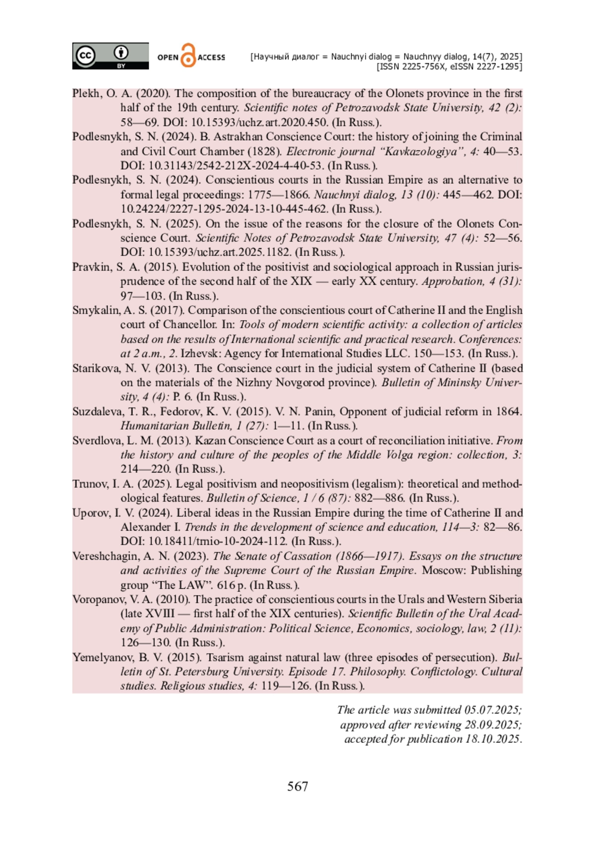 18. Подлесных С. Н. К вопросу о причинах закрытия Олонецкого совестного суда / С. Н. Подлесных // Ученые записки Петрозаводского государственного университета. - 2025. - Т. 47. - № 4. - С. 52-56. - https://doi.org/10.15393/uchz.art.2025.1182.