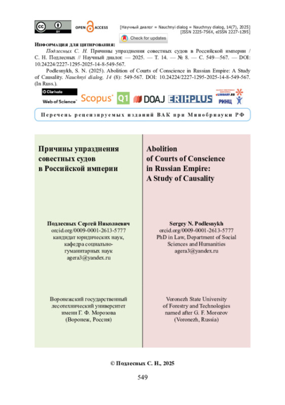 17. Подлесных С. Н. Совестные суды в Российской империи как альтернатива формальному судопроизводству : 1775-1866 годы / С. Н. Подлесных // Научный диалог. - 2024. - Т. 13. - № 10. - С. 445-462. - https://doi.org/10.24224/2227-1295-2024-13-10-445-462.