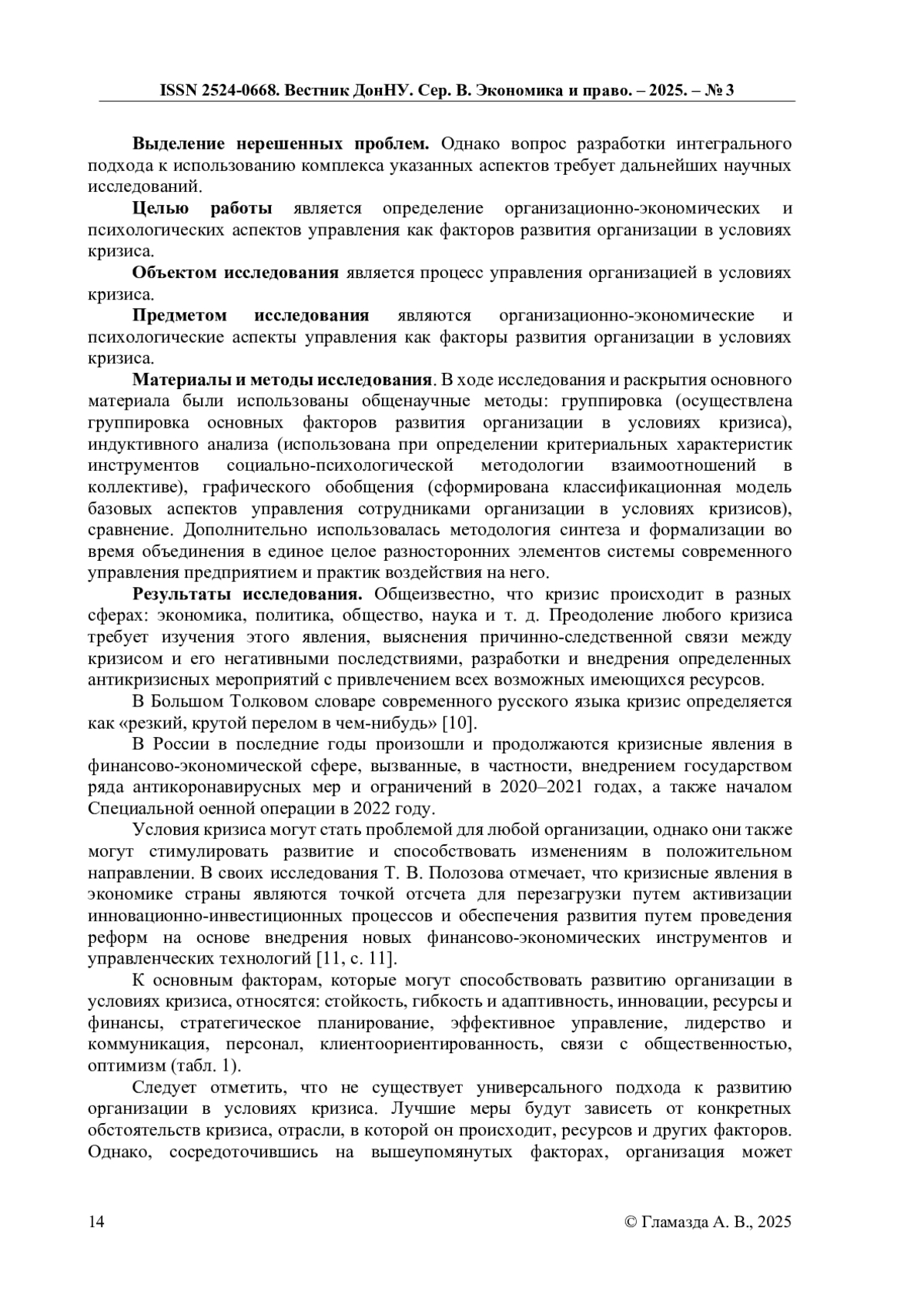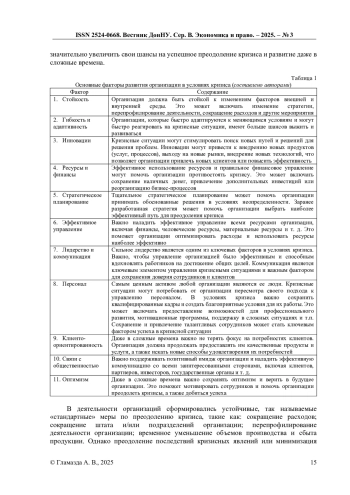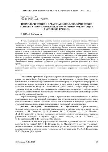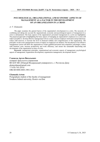 В статье исследованы общие факторы развития организации в условиях кризиса. Обоснована необходимость сочетания и учета организационно-экономических и психологических аспектов управления в условиях кризиса. Выделены базовые аспекты управления персоналом организации в условиях кризиса. Предложенный подход к выделению базовых аспектов управления сотрудниками организации в условиях кризиса позволит: разработать эффективные инструментов управления в условиях кризиса; повысить мотивацию и производительность труда работников; снизить текучесть кадров; повысить уровень финансовой устойчивости и конкурентоспособности организации. Определены принципы антикризисного управления в аспекте воздействия на сотрудников. Внедрение эффективной системы управления позволит организации сохранить квалифицированные кадры и конкурентные преимущества, снизить затраты на удержание персонала, повысить производительность труда и эффективность работы, обеспечить устойчивое функционирование и развитие организации в условиях кризиса.