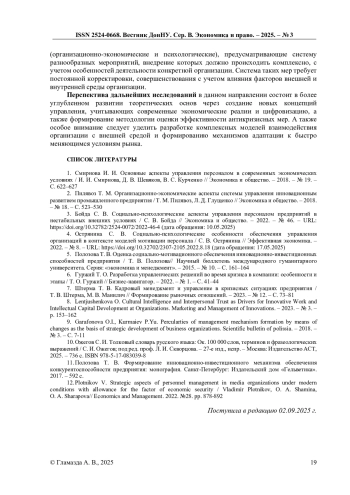 3. Бойда С. В. Социально-психологические аспекты управления персоналом предприятий в нестабильных внешних условиях / С. В. Бойда // Экономика и общество. - 2022. - № 46. - URL: 10.32782/2524-0072/2022-46-4 (дата обращения: 10.05.2025). DOI: 10.32782/2524-0072/2022-46-4(