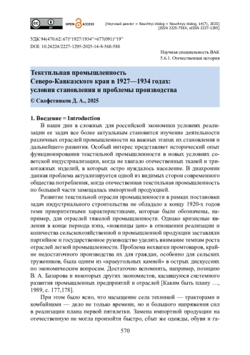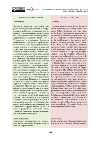 Изучается положение текстильной отрасли легкой промышленности в ставропольских, кубанских, черкесских и других районах Северо-Кавказского края в период его существования как административнотерриториального субъекта (1927—1934). Установлено, что главными факторами формирования текстильной промышленности региона были подходящие климатические условия, тесная связь с сельским хозяйством, традиционные хозяйственные занятия (в первую очередь овцеводство), достаточная ресурсная база для развития подотраслей текстильной промышленности, особенно шерстяной, наличие транспортных путей. Выполнен анализ проблем производственной деятельности отдельных предприятий (шерстопрядильных, суконных, шерстомоечных): нехватка кадров, недостаточная техническая оснащенность и объемы переработки избыточного сырья. Доказано, что текстильная отрасль края в рассматриваемый период проходила свое становление. Выявлено, что главной задачей было строительство или реконструкция государственных текстильных предприятий (фабрик, шерстомоек), способных поглощать вырабатываемую в крае шерсть и производить достаточное количество метражной продукции. Отмечается, что текстильных предприятий в крае было немного, они располагались в основном в городах, вблизи транспортных путей и выстраивали прочные производственные связи с профильными предприятиями, находящимися в других районах РСФСР, а также в республиках Советского Союза, участвуя в укреплении экономических связей между регионами страны.