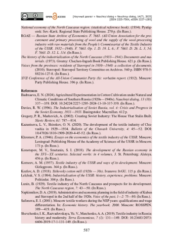 1. Бадмаева Е. Н. Хозяйственный эксперимент по внедрению культуры хлопчатника в природно-климатических условиях Юга России в 1920-1940-е годы / Е. Н. Бадмаева // Научный диалог. - 2024. - Т. 13. - № 10. - С. 337-359. - https://doi.org/10.24224/22271295-2024-13-10- 337-359.