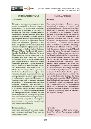Проведено исследование колоративов (цветовых номинаций) в функции маркеров современности и индикаторов актуальных культурных, социальных и политических конфликтов. Выясняется, как цветовая лексика участвует в формировании общественного дискурса, отражая ключевые тренды и противоречия XXI века. Проанализировано около 80 значимых колоративных единиц материала, вошедших в рейтинги «Слово года» за период с 2014 по 2024 годы. Источниками выступили официальные списки «Слова года» от Oxford English Dictionary, Merriam-Webster, Gesellschaft für deutsche Sprache, FundéuRAE и Instituto Cervantes. Материалы для анализа извлечены из публичных корпусов, новостных архивов, социальных медиа и аналитических обзоров, сопровождающих ежегодные лингвистические рейтинги. Проанализированы англо-, немецко- и испаноязычные контексты. Истолкованы номинации Black Lives Matter, Greenwashing, White Supremacy и White Parties. Поднимается вопрос о том, что колоративы все чаще используются для конструирования идеологических позиций и мобилизации аудитории. Показано, что динамика цветовой семантики напрямую коррелирует с социально-политическими сдвигами: например, рост употребления колоративов со значением ‘черный’ связан с глобальным антирасистским движением, ‘зеленый’ — с экологической повесткой и ее коммерциализацией. Новизна исследования видится в том, что впервые предпринята системная межъязыковая реконструкция эволюции колоративов как маркеров современности на основе авторитетных лингвистических рейтингов.