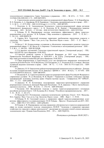 8. Рубцова, Н. В. Формирование системы мониторинга эффективности сферы туристско-рекреационных услуг региона / Н. В. Рубцова // Мир экономики и управления. - 2019. - Т. 19, № 3. - С. 101-110. EDN: HHJYUW