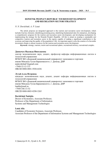 В статье предлагается комплексный подход к развитию туристско-рекреационной сферы, включающий четыре ключевых элемента: определение перспективных направлений, выявление основополагающих правил для предприятий, разработку комплексной программы развития туристско-рекреационной сферы и формирование механизмов реализации стратегии для Донецкой Народной Республики. Все это направлено на создание устойчивой и конкурентоспособной туристско-рекреационной сферы в регионе, способной вносить значительный вклад в экономику и улучшение качества жизни населения. Важным аспектом является также создание благоприятного инвестиционного климата для привлечения ресурсов в развитие туристско-рекреационной сферы.