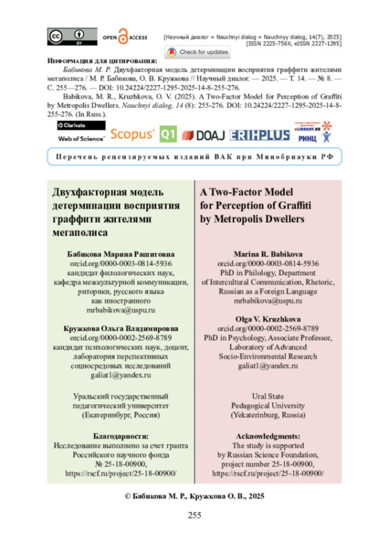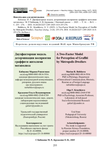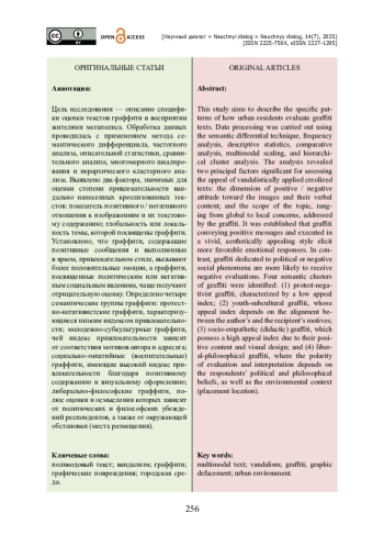 Цель исследования — описание специфики оценки текстов граффити в восприятии жителями мегаполиса. Обработка данных проводилась с применением метода семантического дифференциала, частотного анализа, описательной статистики, сравнительного анализа, многомерного шкалирования и иерархического кластерного анализа. Выявлено два фактора, значимых для оценки степени привлекательности вандально нанесенных креолизованных текстов: показатель позитивного / негативного отношения к изображениям и их текстовому содержанию; глобальность или локальность темы, которой посвящены граффити. Установлено, что граффити, содержащие позитивные сообщения и выполненные в ярком, привлекательном стиле, вызывают более положительные эмоции, а граффити, посвященные политическим или негативным социальным явлениям, чаще получают отрицательную оценку. Определено четыре семантические группы граффити: протестно-негативистские граффити, характеризующиеся низким индексом привлекательности; молодежно-субкультурные граффити, чей индекс привлекательности зависит от соответствия мотивов автора и адресата; социально-эмпатийные (воспитательные) граффити, имеющие высокий индекс привлекательности благодаря позитивному содержанию и визуальному оформлению; либерально-философские граффити, полюс оценки и осмысления которых зависит от политических и философских убеждений респондентов, а также от окружающей обстановки (места размещения).