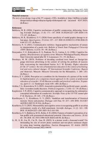 11. Кружкова О. В. Запоминаемость и когнитивные ошибки узнавания граффити в городской среде: результаты полевого эксперимента / О. В. Кружкова // Научный диалог. - 2025. - Т. 14. - № 2. - С. 163-180. - https://doi.org/10.24224/2227-1295-2025-14-2163-180.