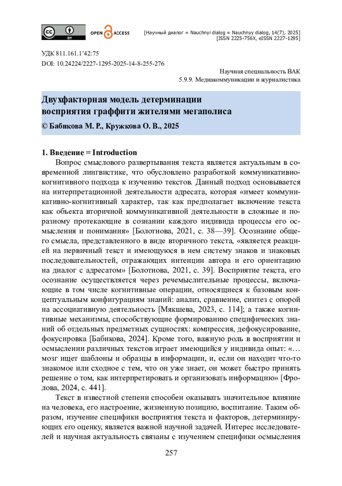 2. Бабикова М. Р. Когнитивные механизмы граффити: компрессия, дефокусирование, фокусировка / М. Р. Бабикова // Научный диалог. - 2024. - Т. 13, № 8. - С. 171- 187. - https://doi.org/10.24224/2227-1295-2024-13-8-171-187.