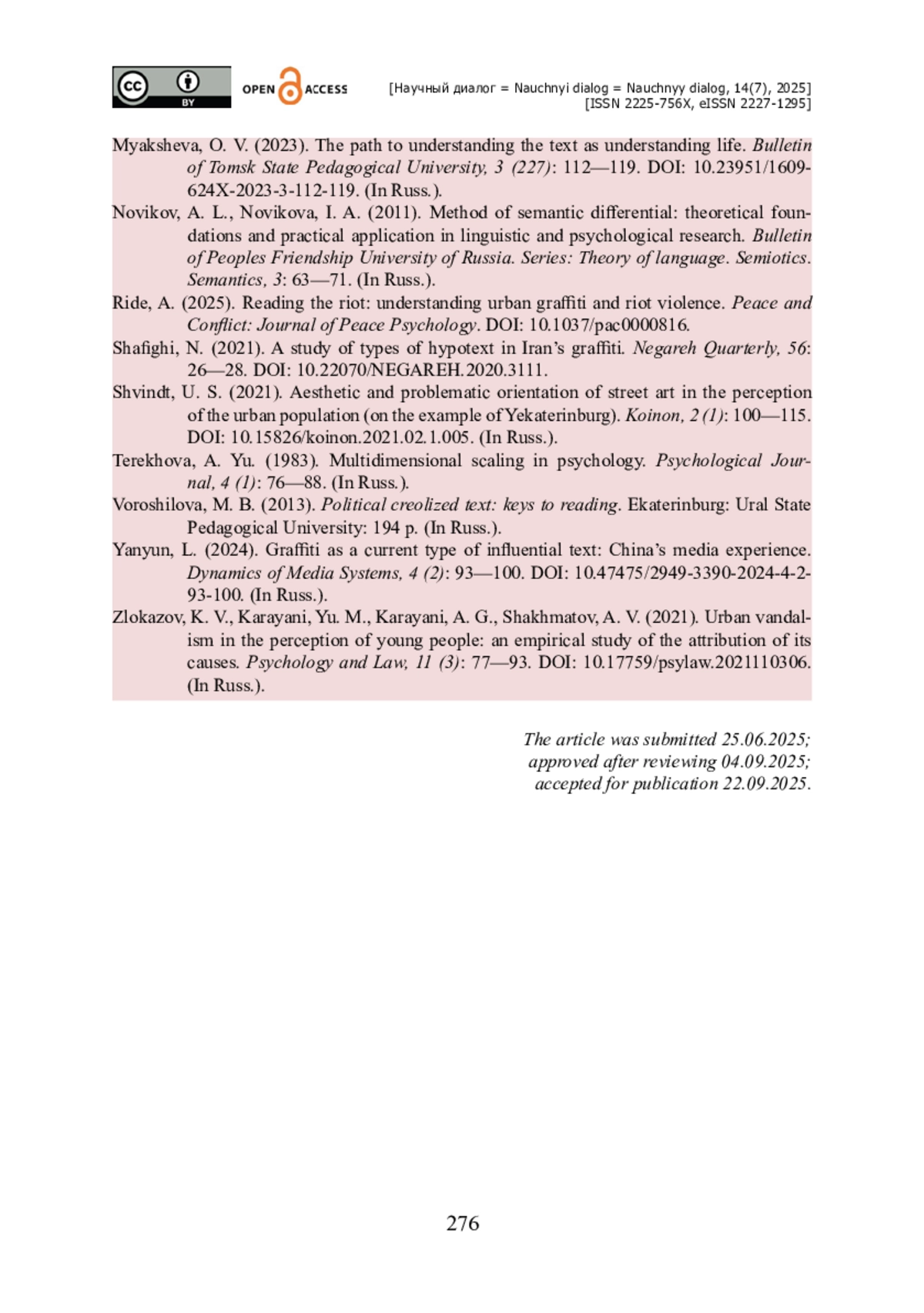 20. Ride A. Reading the Riot: Understanding Urban Graffiti and Riot Violence / A. Ride // Peace and Conflict: Journal of Peace Psychology. - 2025. - https://doi.org/10.1037/pac0000816.