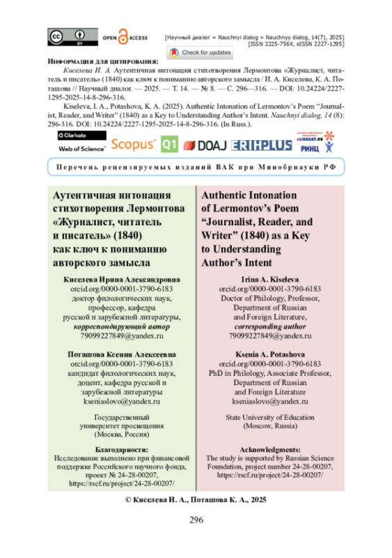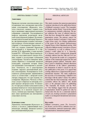 Проведено изучение многочисленных пунктуационных мен, допущенных при публикации стихотворения «Журналист, читатель и писатель», начиная с первого издания и заканчивая современными научными собраниями сочинений. Рассматриваются вопросы нарушения редакторами авторской пунктуационной графики. Источниками выступили беловой автограф Лермонтова, два прижизненных издания стихотворения в журнале «Отечественные записки» и сборнике «Стихотворения Лермонтова» за 1840 год, издание сочинений Лермонтова под редакцией А. А. Краевского, П. А. Ефремова, Д. И. Абрамовича, а также научные издания XX—XXI веков. Представлены результаты сопоставительного анализа беловика, первой и последующих публикаций стихотворения. Уделяется внимание выявлению обработок и искажений авторской пунктуации, устранение которых важно для публикации стихотворения в дальнейшем. Отмечается, что в существующих изданиях нарушен интонационный рисунок стихотворения. Подчеркивается необходимость реконструкции дефинитивного текста в соответствии с авторской волей. Авторы утверждают, что при издании стихотворения «Журналист, Читатель и Писатель» следует опираться на автограф, который отражает авторскую волю. Установлено, что при расстановке пунктуации нужно руководствоваться не только формальными признаками, но и анализом каждого контекста, понимая расставленные Лермонтовым знаки препинания как инотационносмысловую систему.