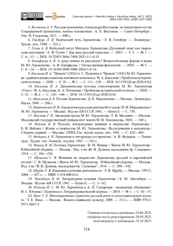 8. Канафьева А. В. А душу можно ль рассказать? Вопросительные формы в языке М. Ю. Лермонтова / А. В. Канафьева // Отечественная филология. - 2024. - № 5. - С. 8-16. - https://doi.org/10.18384/2949-5008-2024-5-8-16.