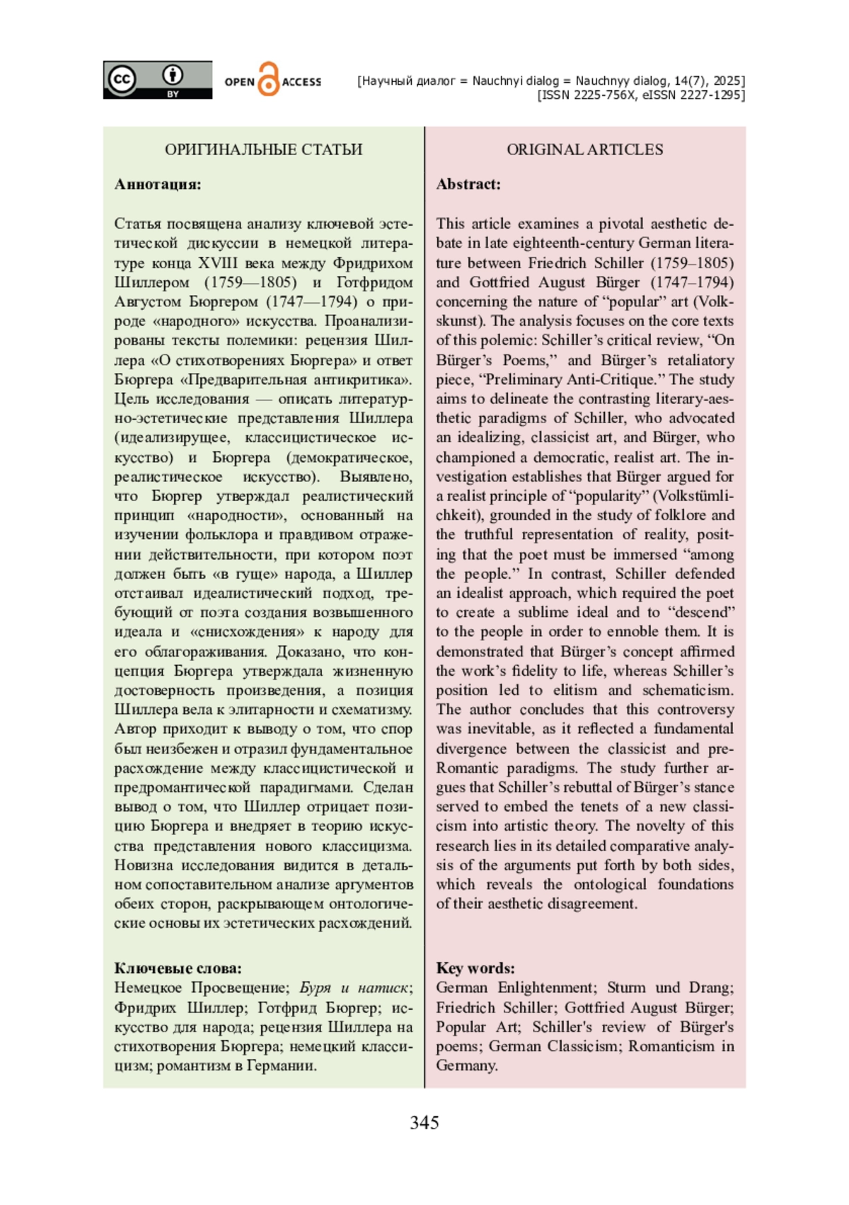 Статья посвящена анализу ключевой эстетической дискуссии в немецкой литературе конца XVIII века между Фридрихом Шиллером (1759—1805) и Готфридом Августом Бюргером (1747—1794) о природе «народного» искусства. Проанализированы тексты полемики: рецензия Шиллера «О стихотворениях Бюргера» и ответ Бюргера «Предварительная антикритика». Цель исследования — описать литературно-эстетические представления Шиллера (идеализирущее, классицистическое искусство) и Бюргера (демократическое, реалистическое искусство). Выявлено, что Бюргер утверждал реалистический принцип «народности», основанный на изучении фольклора и правдивом отражении действительности, при котором поэт должен быть «в гуще» народа, а Шиллер отстаивал идеалистический подход, требующий от поэта создания возвышенного идеала и «снисхождения» к народу для его облагораживания. Доказано, что концепция Бюргера утверждала жизненную достоверность произведения, а позиция Шиллера вела к элитарности и схематизму. Автор приходит к выводу о том, что спор был неизбежен и отразил фундаментальное расхождение между классицистической и предромантической парадигмами. Сделан вывод о том, что Шиллер отрицает позицию Бюргера и внедряет в теорию искусства представления нового классицизма. Новизна исследования видится в детальном сопоставительном анализе аргументов обеих сторон, раскрывающем онтологические основы их эстетических расхождений.