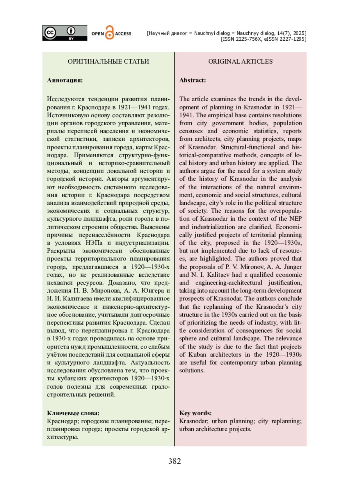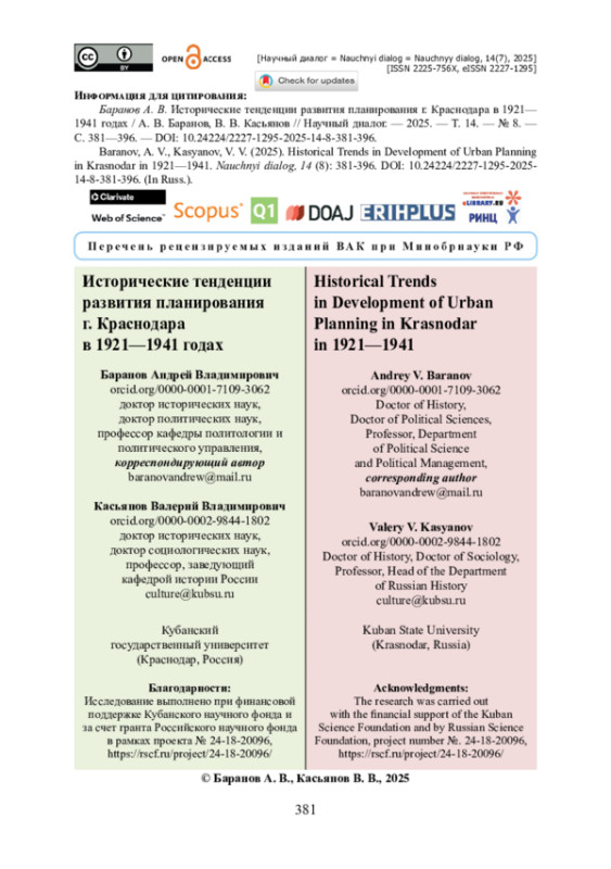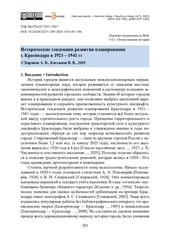 Исследуются тенденции развития планирования г. Краснодара в 1921—1941 годах. Источниковую основу составляют резолюции органов городского управления, материалы переписей населения и экономической статистики, записки архитекторов, проекты планирования города, карты Краснодара. Применяются структурно-функциональный и историко-сравнительный методы, концепции локальной истории и городской истории. Авторы аргументируют необходимость системного исследования истории г. Краснодара посредством анализа взаимодействий природной среды, экономических и социальных структур, культурного ландшафта, роли города в политическом строении общества. Выяснены причины перенаселённости Краснодара в условиях НЭПа и индустриализации. Раскрыты экономически обоснованные проекты территориального планирования города, предлагавшиеся в 1920—1930-х годах, но не реализованные вследствие нехватки ресурсов. Доказано, что предложения П. В. Миронова, А. А. Юнгера и Н. И. Калитаева имели квалифицированное экономическое и инженерно-архитектурное обоснование, учитывали долгосрочные перспективы развития Краснодара. Сделан вывод, что перепланировка г. Краснодара в 1930-х годах проводилась на основе приоритета нужд промышленности, со слабым учётом последствий для социальной сферы и культурного ландшафта. Актуальность исследования обусловлена тем, что проекты кубанских архитекторов 1920—1930-х годов полезны для современных градостроительных решений.