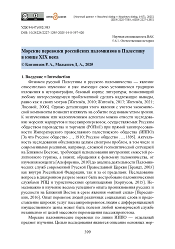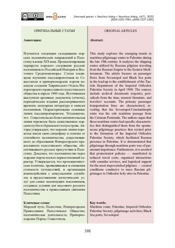 Изучаются тенденции складывания морских паломнических направлений в Палестину в конце XIX века. Проанализированы маршруты морского следования русских паломников из Российской Империи в Восточное Средиземноморье. Статья посвящена изучению пассажиропотоков из Севастополя и причерноморских портов накануне создания Таврического Отдела Императорского православного палестинского общества в апреле 1900 года. Источниками выступили архивные документы (отчеты), периодические издания рассматриваемого времени, мемуарная литература и записки паломников. Охарактеризованы основные линии пассажироперевозок. Установлено, что Севастопольско-Константинопольская линия перевозок была единственным морским путём из Крымского полуострова. Авторы утверждают, что морские линии перевозок имели свою специфику и отличие от стихийного паломничества, существовавшего до образования Императорского православного палестинского общества, обеспечивавшего русское присутствие в Палестине. Доказано, что паломничество через морские порты носило первостепенный характер. Утверждается, что протекционистская политика, проявлявшаяся в снижении стоимости путешествий, в организации взаимодействия с консульскими службами, в предоставлении логистических услуг для самых малоимущих поклонников, создавала условия для массового русского паломничества к православным святыням Палестины.