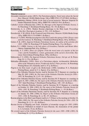 4. Бирюкова К. В. Российская Духовная Миссия в Иерусалиме и Императорское Православное Палестинское Общество / К. В. Бирюкова // Ученые записки Орловского государственного университета. - 2017. - № 2 (75). - С. 11-17.