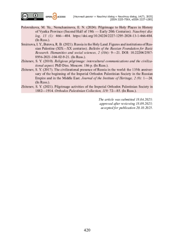 19. Половникова М. Ю. Паломничество к святым местам в истории Вятской губернии (вторая половина XIX - начало XX веков) / М. Ю. Половникова, Е. Н. Немчанинова // Научный диалог. - 2024. - № 13 (1). - С. 466-484. - https://doi.org/10.24224/2227-12952024-13-1-466-484.