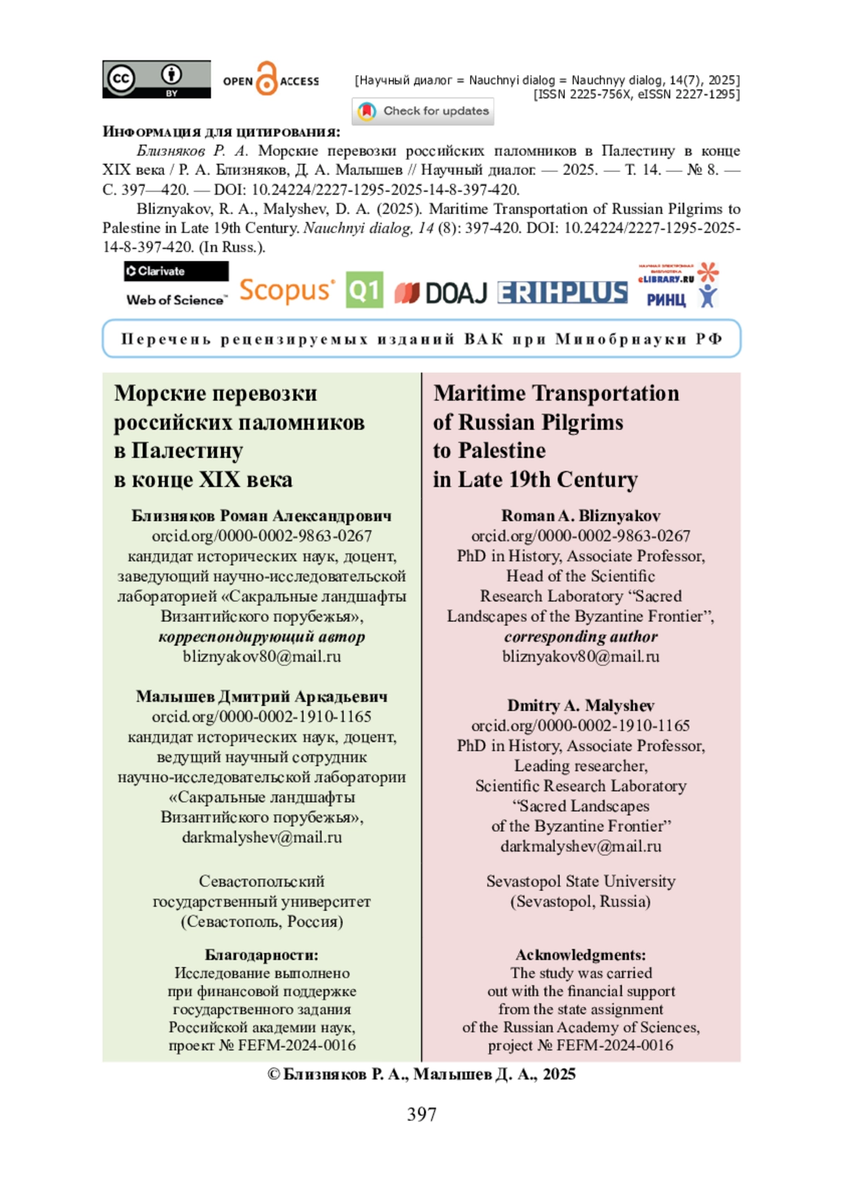 3. Балдин К. Е. Деятельность Императорского Православного Палестинского Общества на Ближнем Востоке в конце XIX - начале XX века (на материале паломнических мемуаров) / К. Е. Балдин // Вестник Воронежского государственного университета. Серия : История. Политология. Социология. - 2014. - № 2. - С. 30-32.