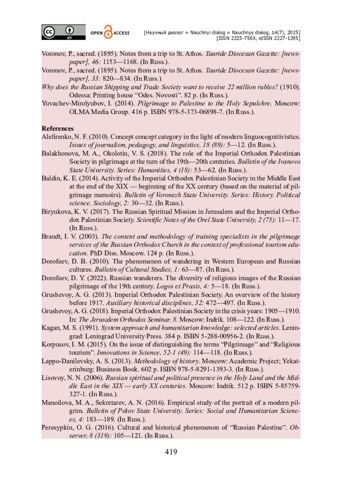 18. Пересыпкин О. Г. Культурно-исторический феномен «Русская Палестина» / О. Г. Пересыпкин // Обозреватель. - 2016. - № 8 (319). - С. 105-121.