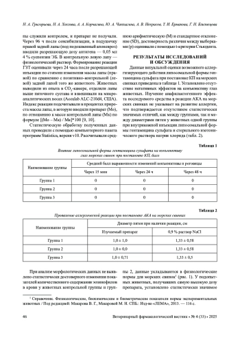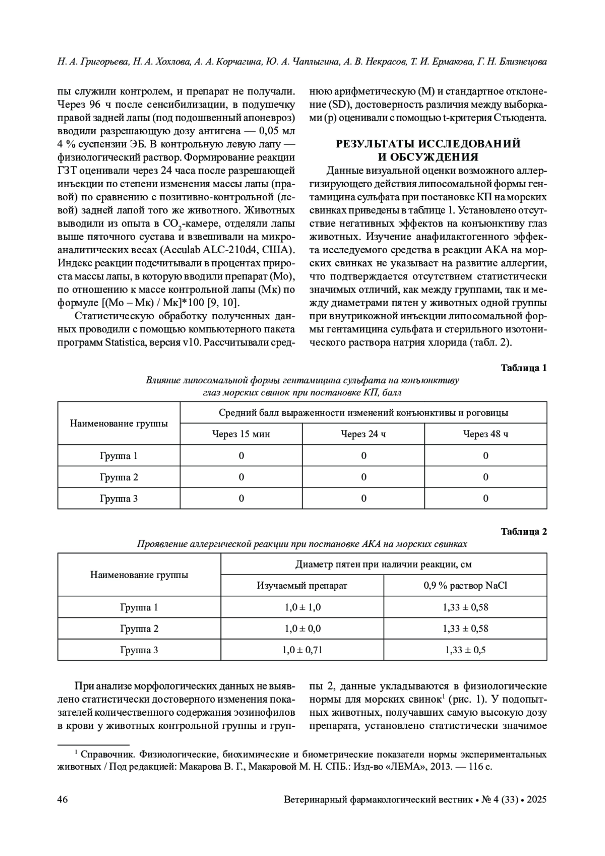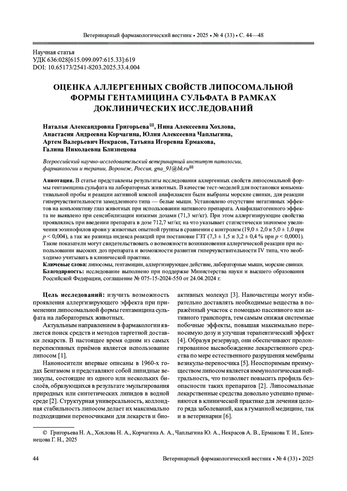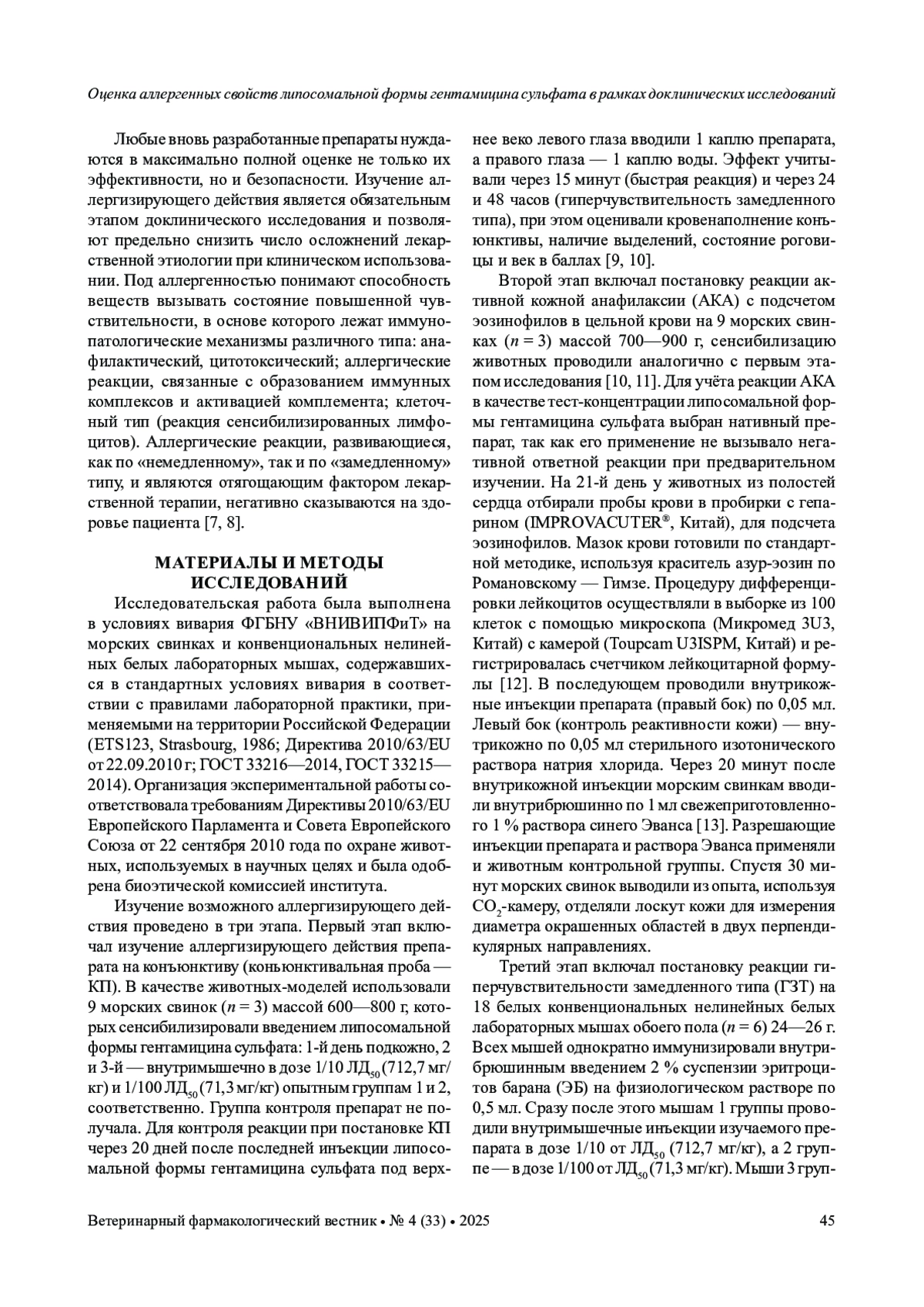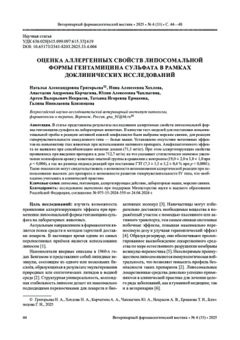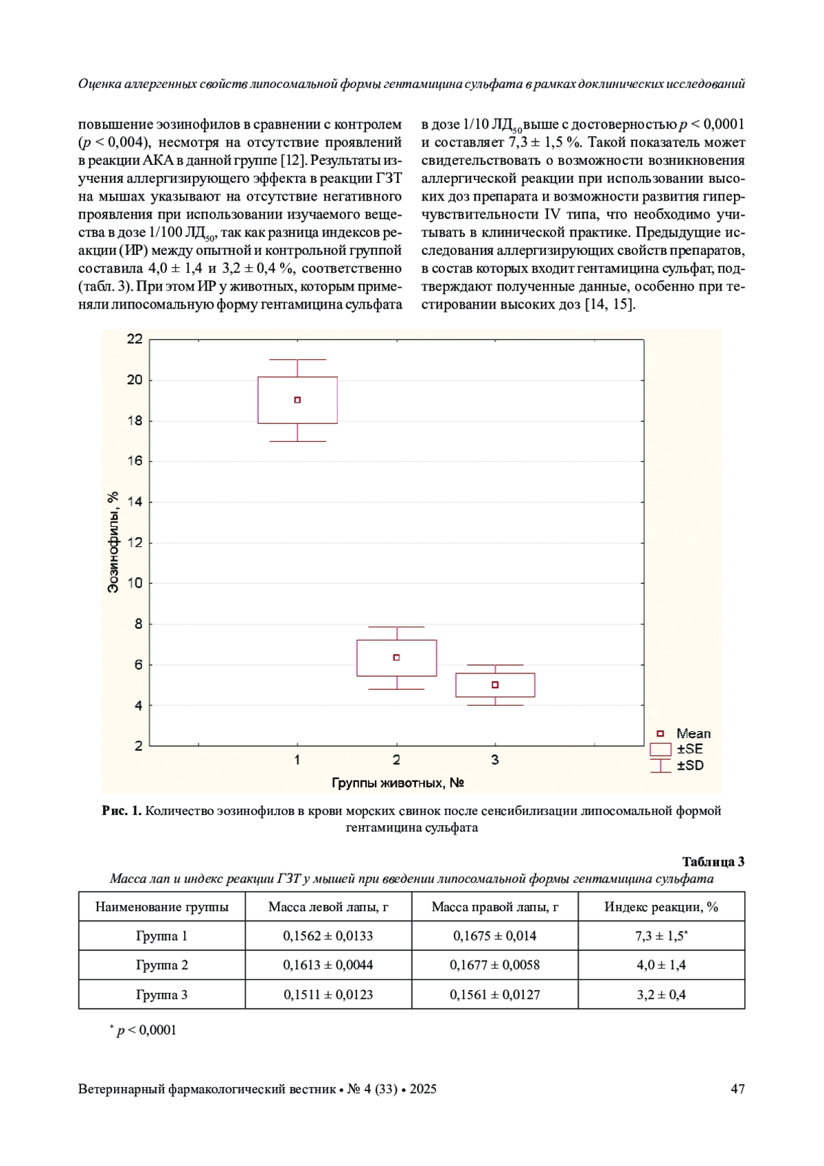 В статье представлены результаты исследования аллергенных свойств липосомальной формы гентамицина сульфата на лабораторных животных. В качестве тест - моделей для постановки коньюнктивальной пробы и реакции активной кожной анафилаксии были выбраны морские свинки, для реакциигиперчувствительности замедленного типа - белые мыши. Установлено отсутствие негативных эффектов на конъюнктиву глаз животных при использовании нативного препарата. Анафилактогенного эффекта не выявлено при сенсибилизации низкими дозами (71,3 мг/кг). При этом аллергизирующие свойства проявлялись при введении препарата в дозе 712,7 мг/кг, на что указывает статистически значимое увеличения эозинофилов крови у животных опытной группы в сравнении с контролем (19,0 ± 2,0 и 5,0 ± 1,0 прир < 0,004), а так же разница индекса реакций при постановке ГЗТ (7,3 ± 1,5 и 3,2 ± 0,4 % при р < 0,0001). Такие показатели могут свидетельствовать о возможности возникновения аллергической реакции при использовании высоких доз препарата и возможности развития гиперчувствительности IV типа, что необходимо учитывать в клинической практике.