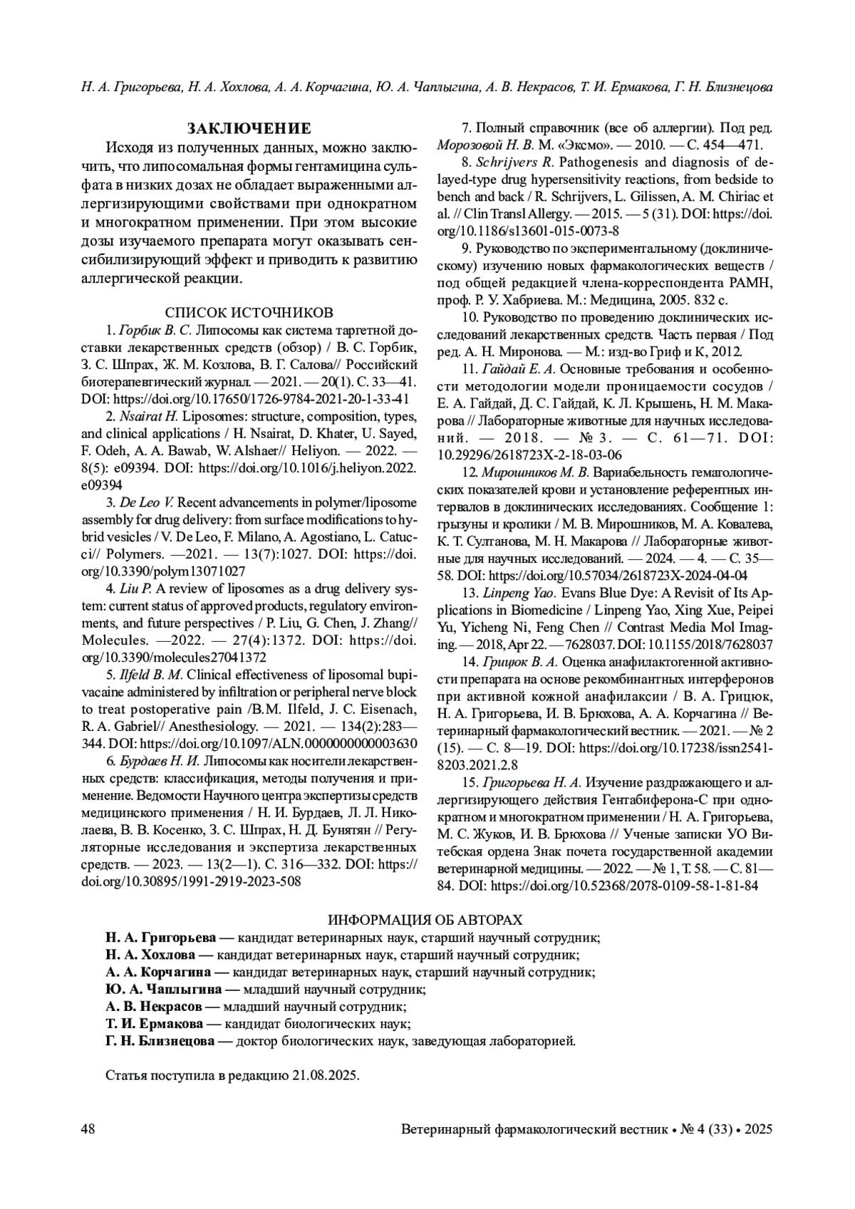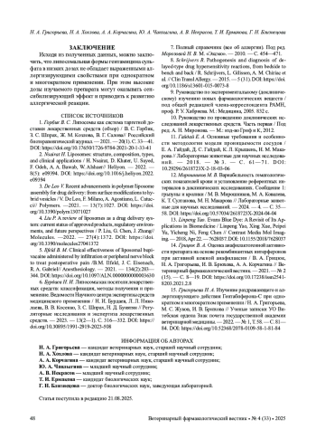 1. Горбик В. С. Липосомы как система таргетной доставки лекарственных средств (обзор) / В. С. Горбик, З. С. Шпрах, Ж. М. Козлова, В. Г. Салова// Российский биотерапевтический журнал. - 2021. - 20(1). С. 33-41. DOI: 10.17650/1726-9784-2021-20-1-33-41 EDN: GJUXAF