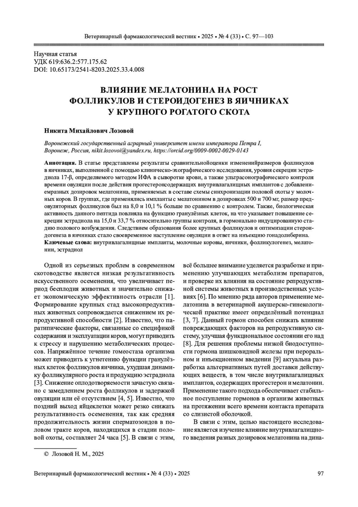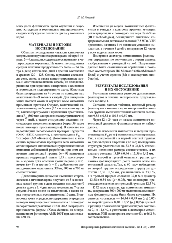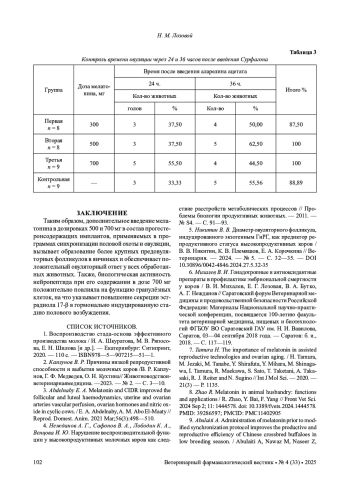 5. Никитин В. В. Диаметр овуляторного фолликула, индуцированного экзогенным ГнРГ, как предиктор репродуктивного статуса высокопродуктивных коров / В. В. Никитин, К. В. Племяшов, Е. А. Корочкина // Ветеринария. - 2024. - № 5. - С. 32-35. DOI: 10.30896/0042-4846.2024.27.5.32-35