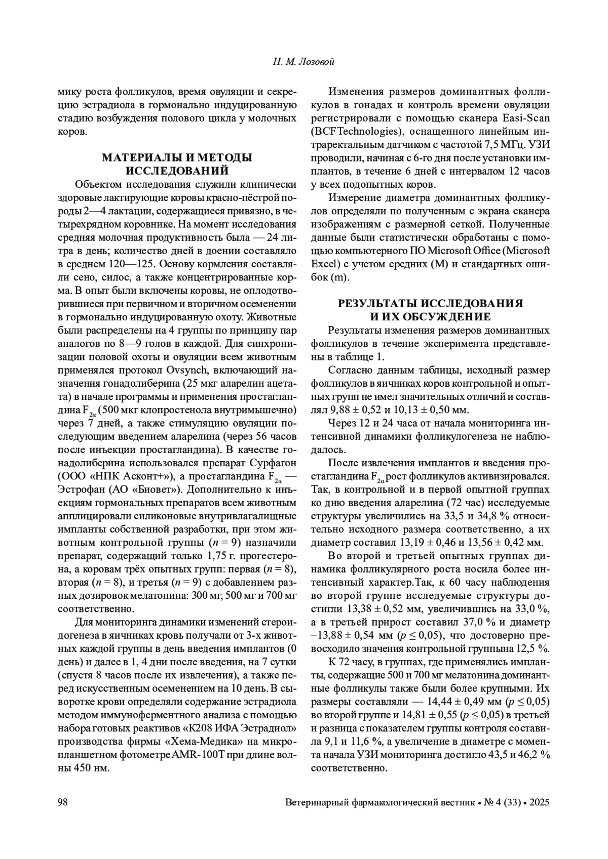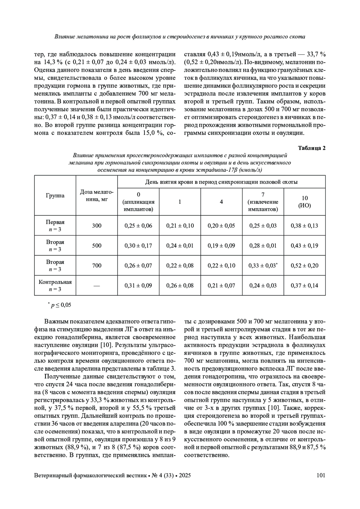 В статье представлены результаты сравнительнойоценки измененийразмеров фолликулов в яичниках, выполненной с помощью клиническо - эхографического исследования, уровня секреции эстрадиола 17-β, определяемого методом ИФА в сыворотке крови, а также ультрасонографического контроля времени овуляции после действия прогестеронсодержащих внутривлагалищных имплантов с добавлением разных дозировок мелатонина, применяемых в составе схемы синхронизации половой охоты у молочных коров. В группах, где применялись импланты с мелатонином в дозировках 500 и 700 мг, размер предовуляторных фолликулов был на 8,0 и 10,1 % больше по сравнению с контролем. Также, биологическая активность данного пептида повлияла на функцию гранулёзных клеток, на что указывает повышение секреции эстрадиола на 15,0 и 33,7 % относительно группы контроля, в гормонально индуцированную стадию полового возбуждения. Следствием образования более крупных фолликулов и оптимизации стероидогенеза в яичниках стало своевременное наступление овуляции в ответ на инъекцию гонадолиберина.