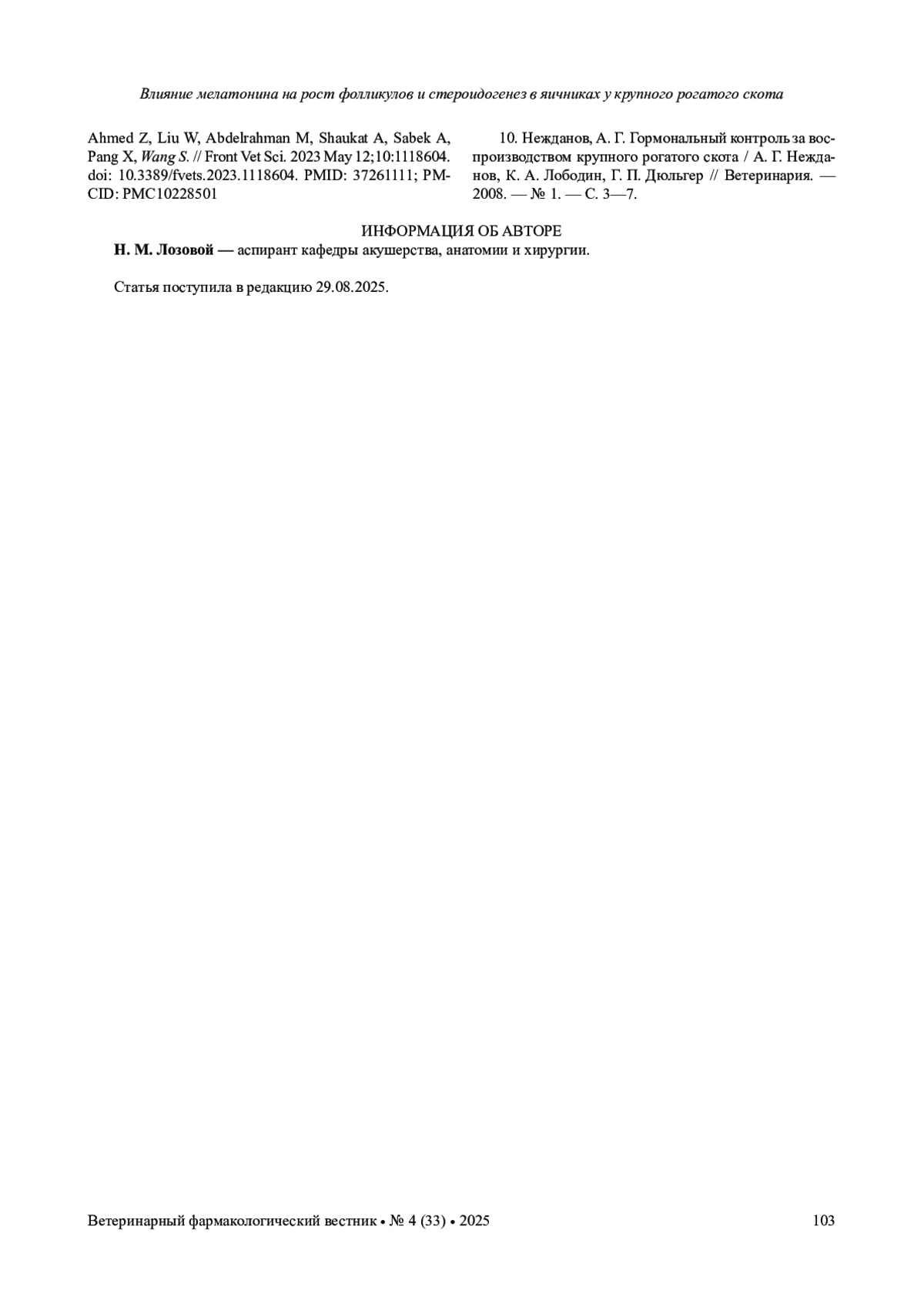 10. Нежданов, А. Г. Гормональный контроль за воспроизводством крупного рогатого скота / А. Г. Нежданов, К. А. Лободин, Г. П. Дюльгер // Ветеринария. - 2008. - № 1. - С. 3-7.