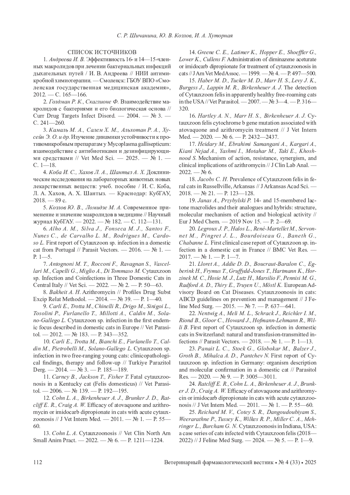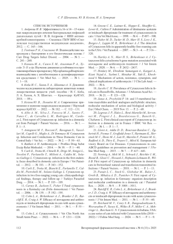 7. Antognoni M. T., Rocconi F., Ravagnan S., Vascellari M., Capelli G., Miglio A., Di Tommaso M. Cytauxzoon sp. Infection and Coinfections in Three Domestic Cats in Central Italy // Vet Sci. - 2022. - № 2. - P. 50-63.
