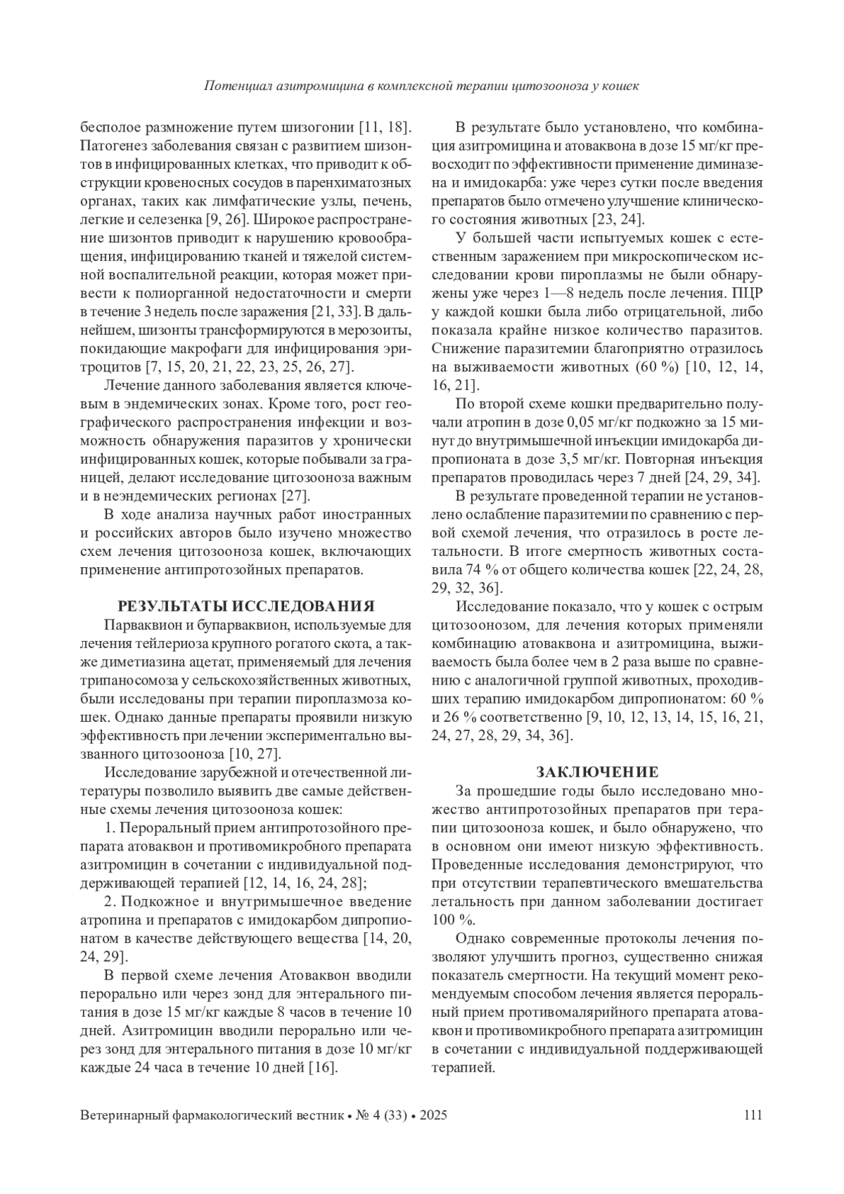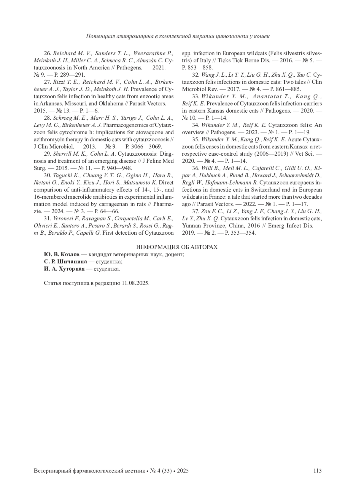 33. Wikander Y. M., Anantatat T., Kang Q., Reif K. E. Prevalence of Cytauxzoon felis infection-carriers in eastern Kansas domestic cats // Pathogens. - 2020. - № 10. - P. 1-14. EDN: SCIZIC