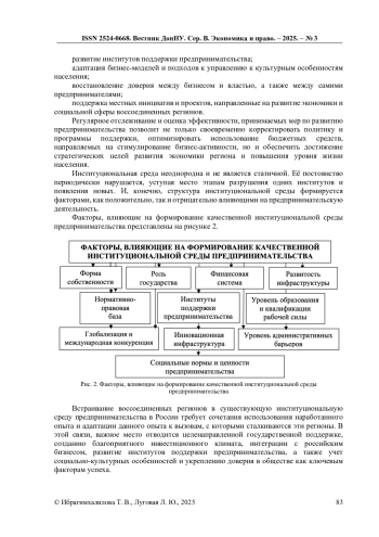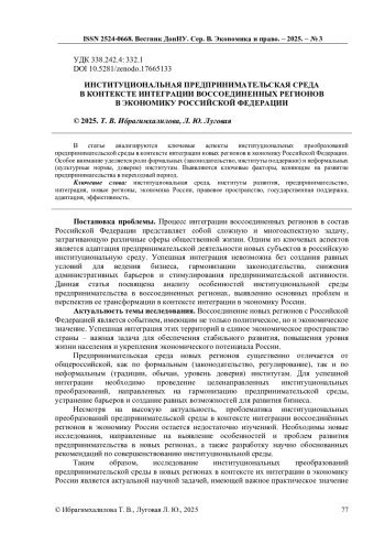 В статье анализируются ключевые аспекты институциональных преобразований предпринимательской среды в контексте интеграции новых регионов в экономику Российской Федерации. Особое внимание уделяется роли формальных (законодательство, институты поддержки) и неформальных (культурные нормы, доверие) институтам. Выявляются ключевые факторы, влияющие на развитие предпринимательства в переходный период.