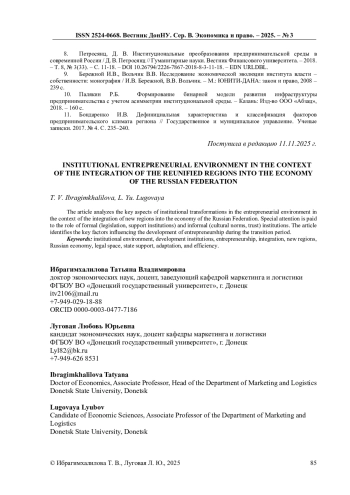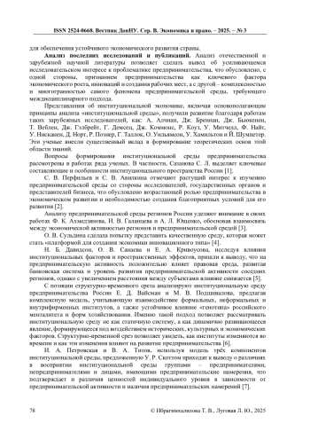 7. Петровская, И. А. Институциональная среда предпринимательства в России / И. А. Петровская, В. А. Титов // Вестник Московского университета. Серия 6: Экономика. - 2017. - № 5. - С. 21-39. EDN: ZRDONR