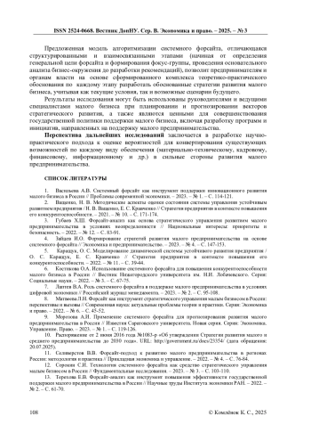 7. Лаптев В.А. Роль системного форсайта в поддержке малого предпринимательства в условиях цифровой экономики // Российский журнал менеджмента. - 2023. - № 2. - С. 95-108.