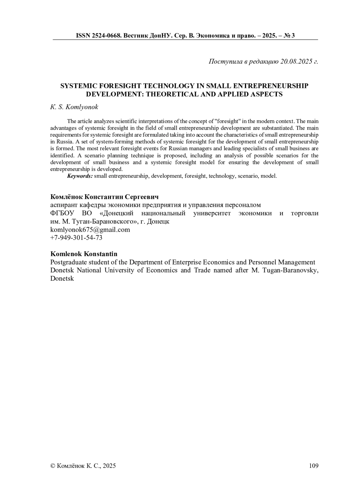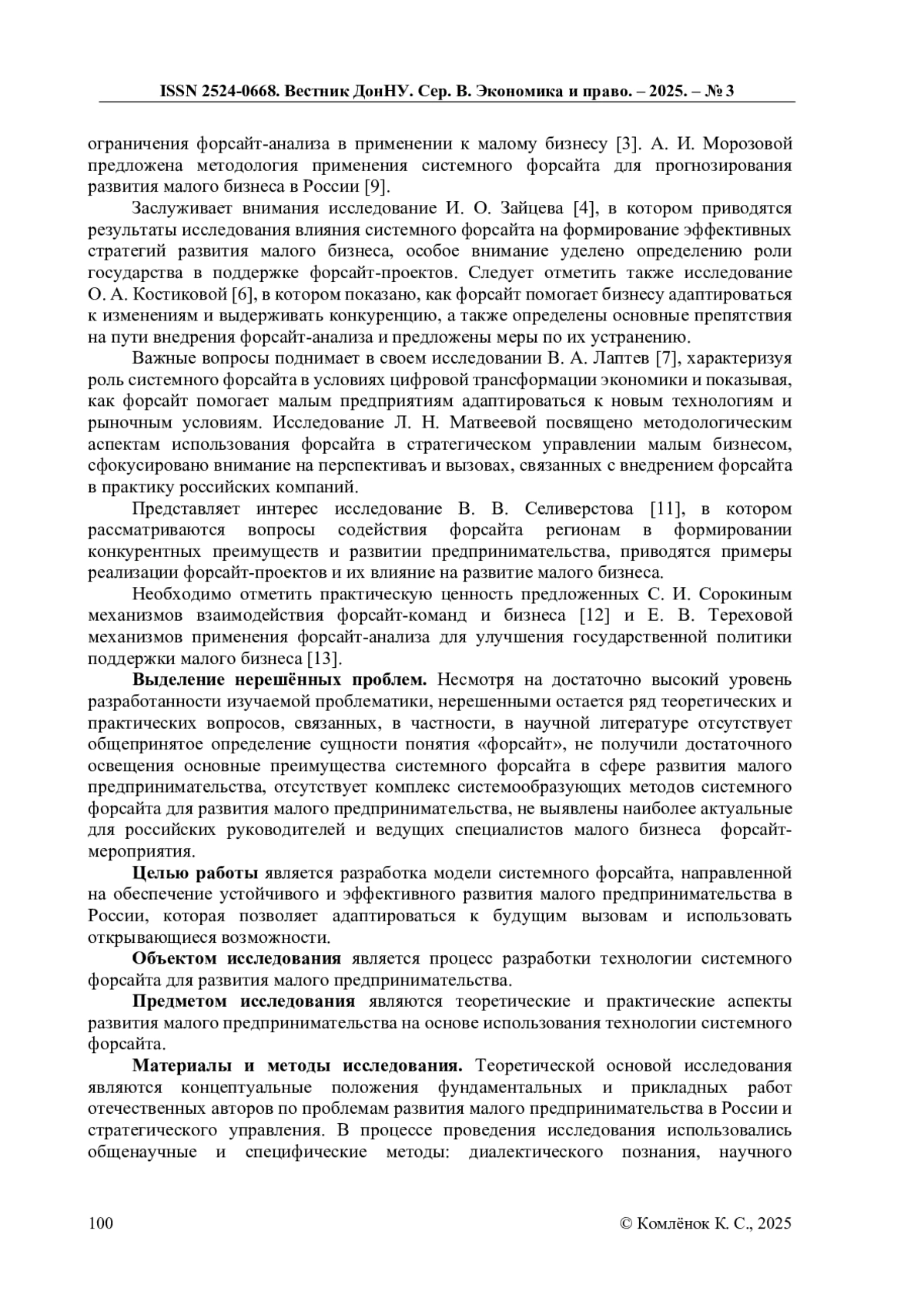 9. Морозова А.И. Применение системного форсайта для прогнозирования развития малого предпринимательства в России // Известия Саратовского университета. Новая серия. Серия: Экономика. Управление. Право. - 2023. - № 1. - С. 119-126.